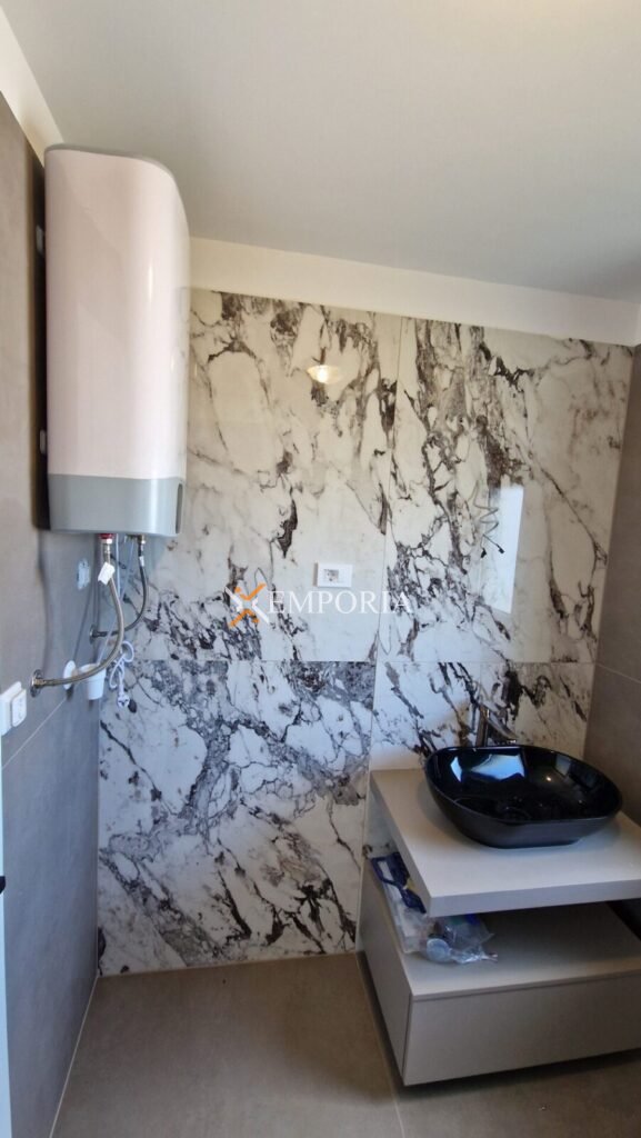 Raumaufteilung besteht aus Flur, 2 Schlafzimmern, Badezimmer, Schlafzimmer mit Badezimmer, Küche mit Wohnzimmer und Esszimmer und zwei Terrassen. Nettonutzfläche der beschriebenen Räumlichkeiten beträgt 107,23 m2. Außerdem verfügt die Wohnung zusätzlich noch über eine Dachterrasse und einen Stellplatz.