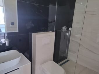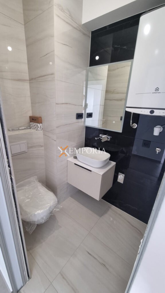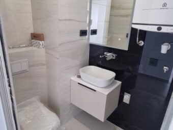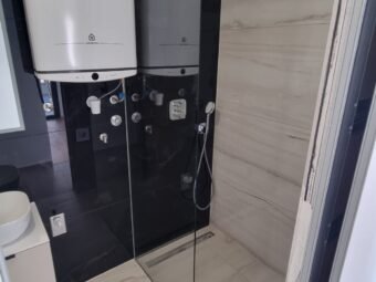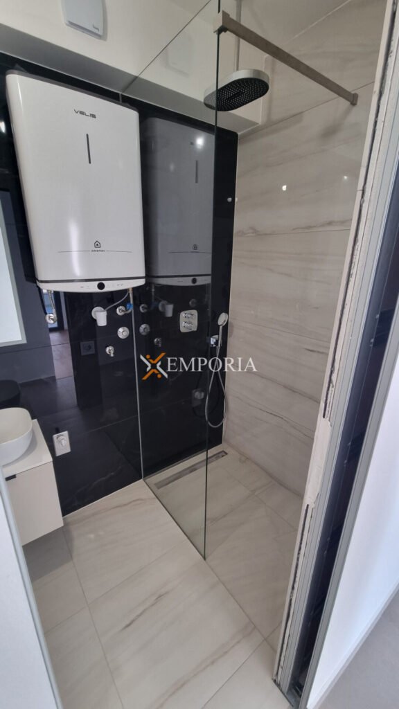 Konstruktion mit gemauerten Thermoblöcken. Fassadenwärmedämmung 10 cm Styropor. Bodenbeläge sind Fliesen und Parkett. Aluminiumfenster mit dreischichtigem Glas, Moskitonetzen und elektrischen Rollläden und Jalousien. Klimaanlagen befinden sich im Wohnzimmer und in jedem Schlafzimmer. Zusätzlich elektrische Fußbodenheizung im Badezimmer. Darüber hinaus ist die Eingangstür einbruchsicher und feuerfest. Zu dieser Wohnung gehört eine Außendusche im Hof.