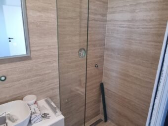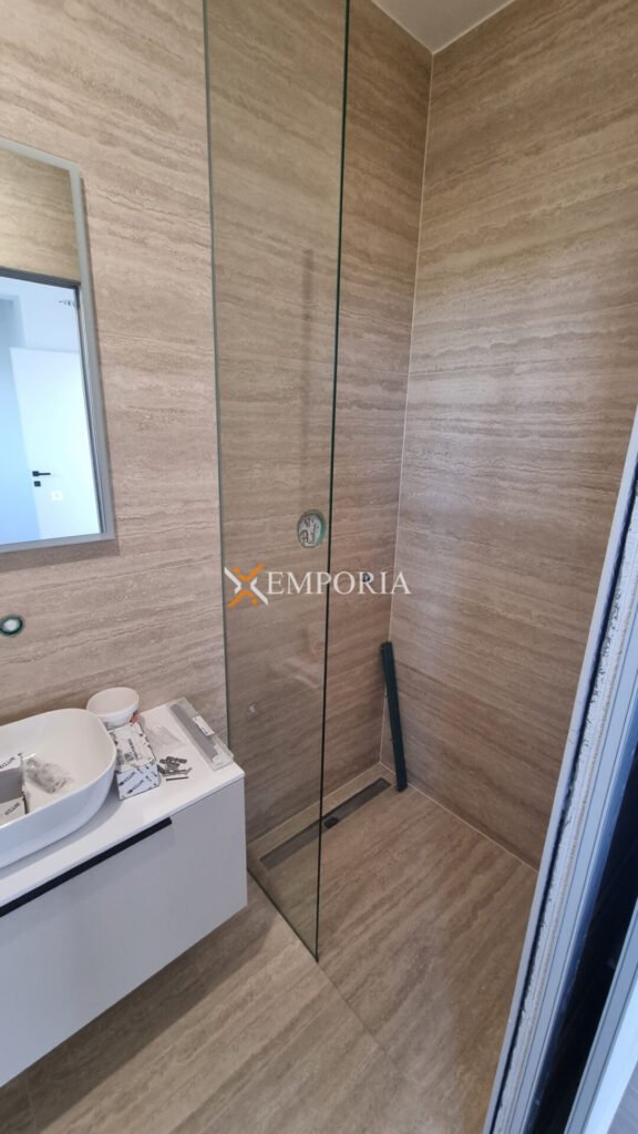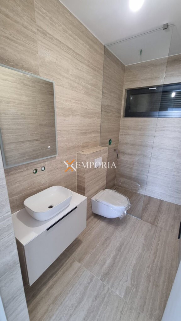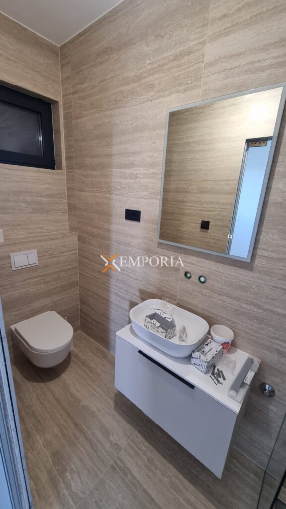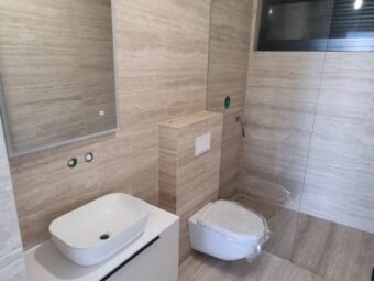 Konstruktion mit gemauerten Thermoblöcken. Fassadenwärmedämmung 10 cm Styropor. Bodenbeläge sind Fliesen und Parkett. Aluminiumfenster mit dreischichtigem Glas, Moskitonetzen und elektrischen Rollläden und Jalousien. Klimaanlagen befinden sich im Wohnzimmer und in jedem Schlafzimmer. Zusätzlich Fußbodenheizung in der ganzen Wohnung durch Wärmepumpen. Darüber hinaus ist die Eingangstür einbruchsicher und feuerfest. Zu dieser Wohnung gehört eine Außendusche im Hof.