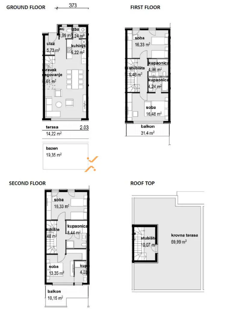 Darüber hinaus führt eine Innentreppe zur Dachterrasse von 69,99 m2