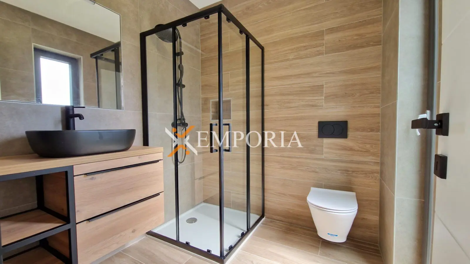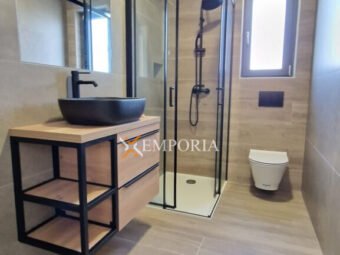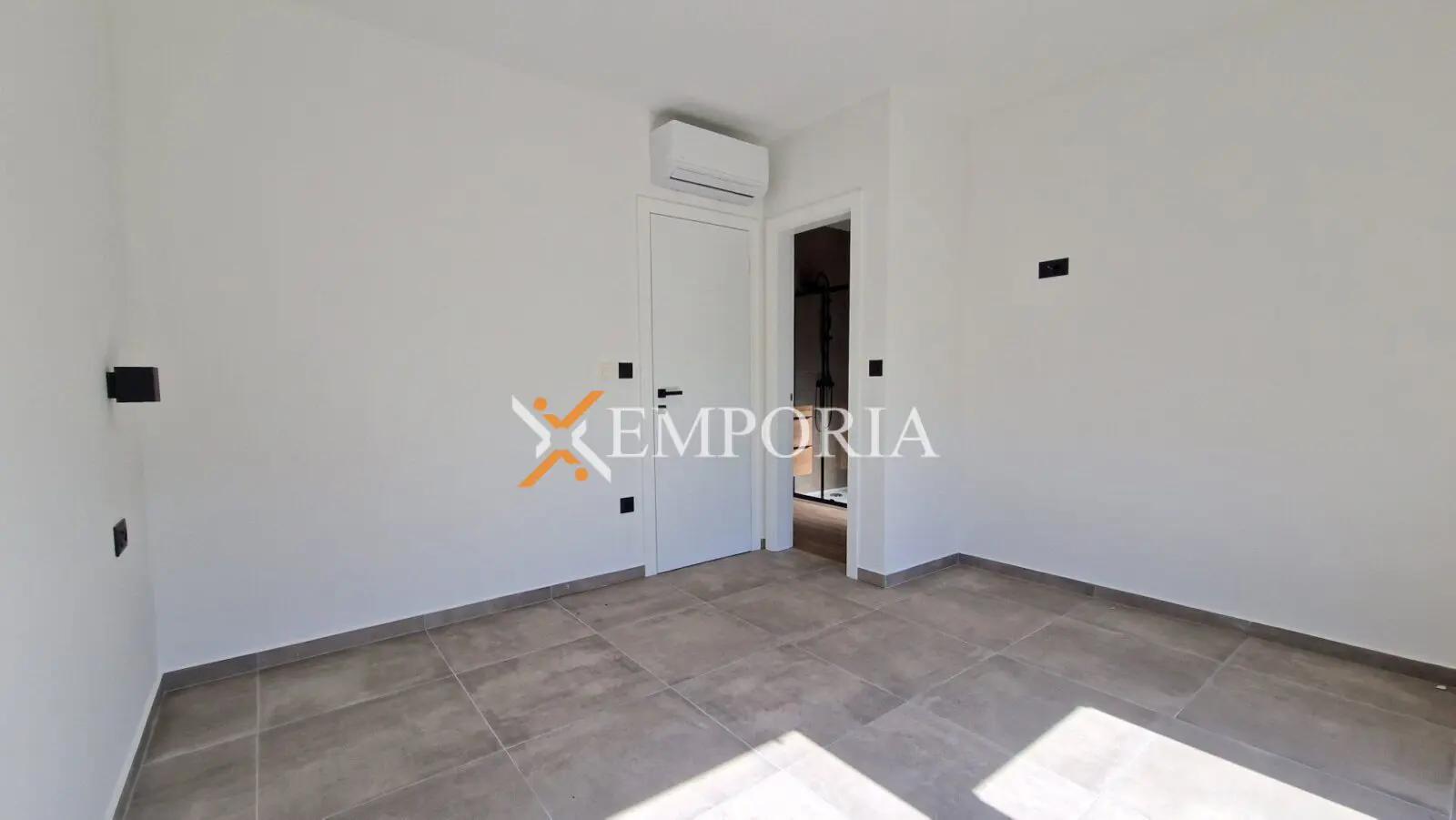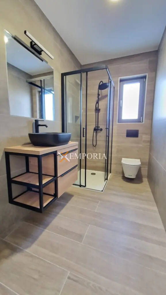 Die Konstruktion erfolgte mit Thermoziegelblöcken. Die Fassade verfügt über eine 10 cm dicke Styropor-Wärmedämmung. Die Bodenbeläge sind Fliesen. Fenster bestehen aus PVC-Material mit Dreischichtglas, Rollläden und Moskitonetzen. Das Wohnzimmer und die Schlafzimmer sind klimatisiert. Die gesamte Wohnung verfügt über eine elektrische Fußbodenheizung. Die Eingangstür der Wohnung ist einbruchhemmend und feuerbeständig.