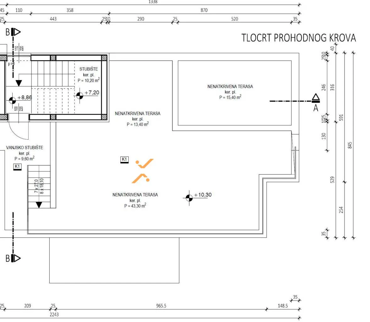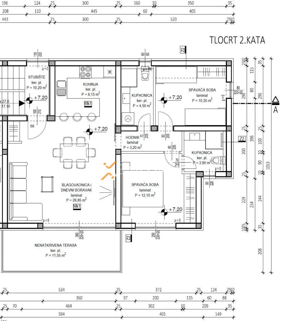 Dies ist eine Wohnung im zweiten Stock. Die Raumaufteilung besteht aus einem Flur, einem Schlafzimmer, einem Schlafzimmer mit Bad, einem Badezimmer, einer Küche mit Esszimmer und Wohnzimmer sowie einer überdachten Terrasse. Die Nettonutzfläche der Wohnung mit Terrasse beträgt 76,93 m2. Darüber hinaus gehören zur Wohnung auch 2 Parkplätze und eine Dachterrasse von 72,10 m2. Die Dachterrasse schmückt ein Pool, einer Pergola und ein Grill.