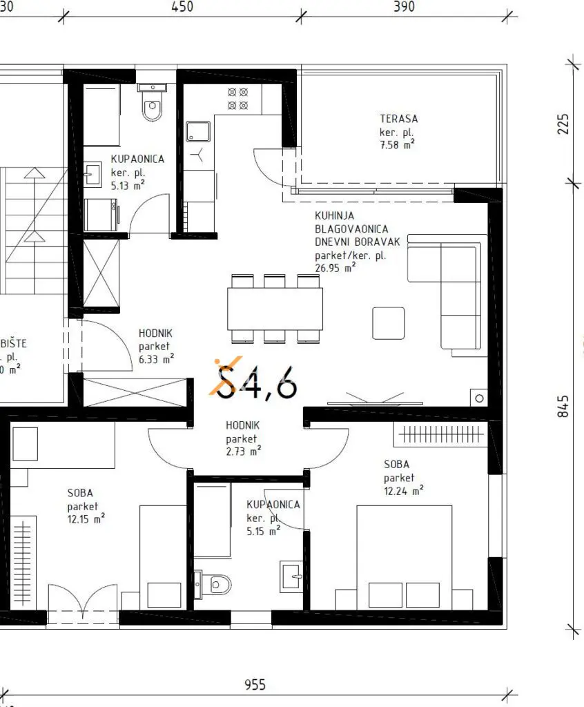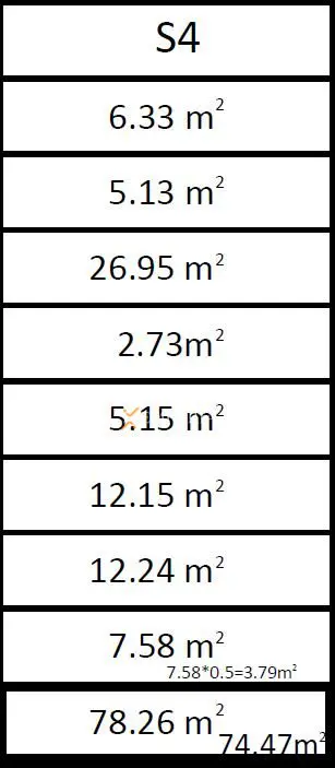 Insgesamt befinden sich im Gebäude 6 Wohnungen. Die Raumaufteilung besteht aus einem Flur, 2 Schlafzimmer, eines davon mit eigenem Bad, Bad, Küche mit Esszimmer und Wohnzimmer und Terrasse. Die Nettofläche des Beschriebenen beträgt 74,47 m2. Darüber hinaus verfügt die Wohnung über einen Parkplatz.