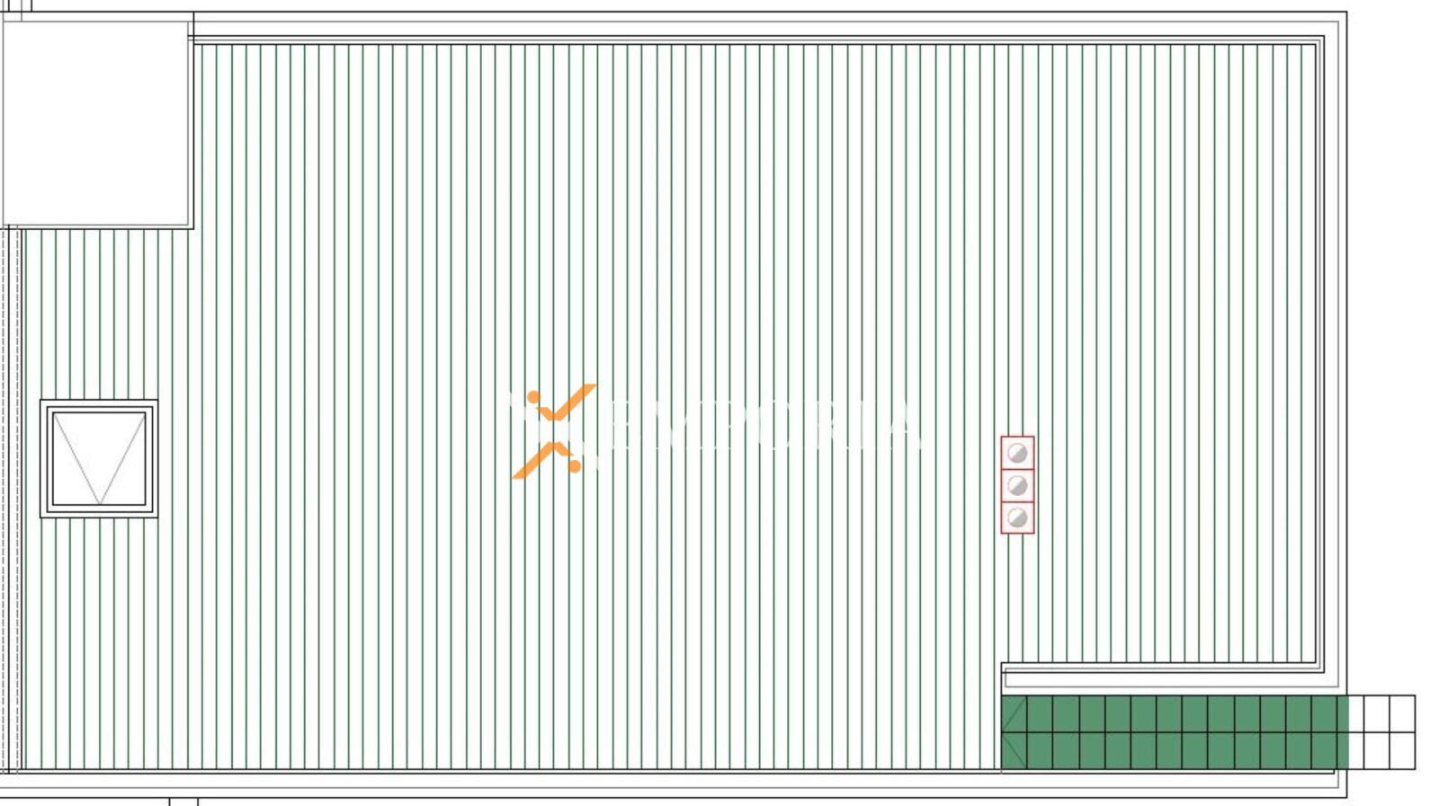 Die Raumaufteilung besteht aus einem Flur, einem Badezimmer, zwei Schlafzimmern, einem Schlafzimmer mit eigenem Bad, einer Küche, einem Esszimmer und einem Wohnzimmer sowie einer nicht überdachten Terrasse. Von der nicht überdachten Terrasse führen Treppen zur Dachterrasse von 102,29 m2. Die Nettonutzfläche der beschriebenen Räumlichkeiten beträgt 121,22 m2. Zur Wohnung gehören auch zwei Parkplätze vor dem Gebäude.