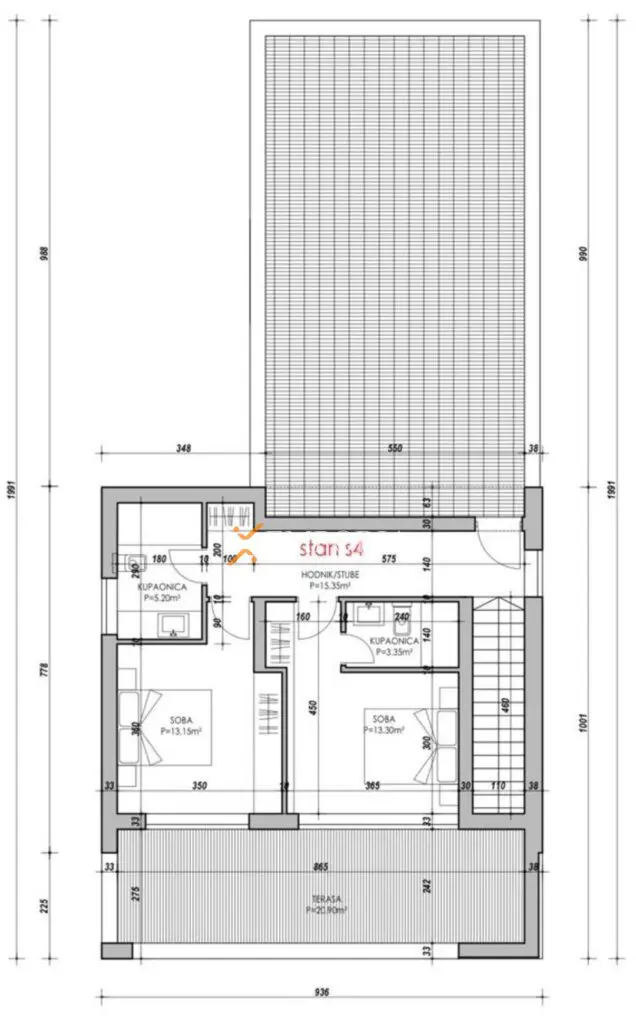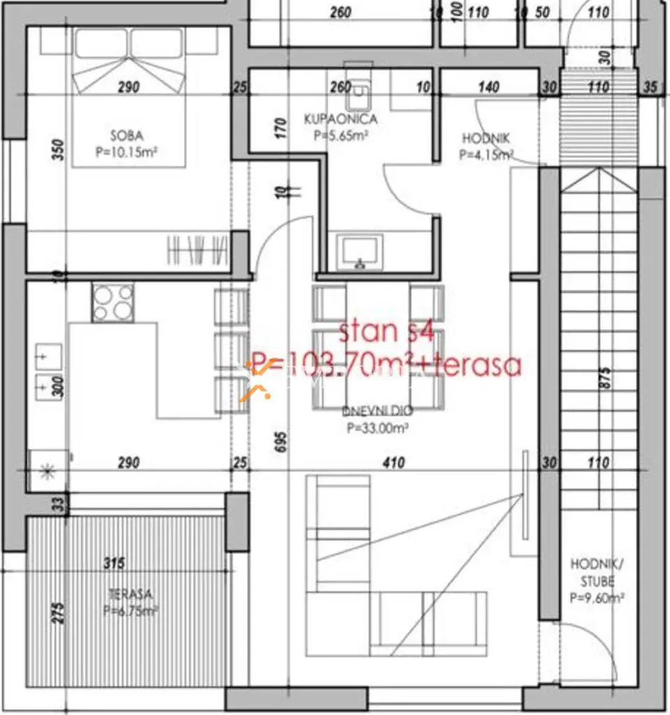 Die Raumaufteilung im 1. Stock besteht aus einem Flur, einem Badezimmer, einem Schlafzimmer, einer Küche mit Esszimmer und Wohnzimmer sowie einer Loggia. Eine Innentreppe führt in den zweiten Stock, wo sich ein Flur, ein Badezimmer, ein Schlafzimmer, ein Schlafzimmer mit Badezimmer, eine Loggia und eine Dachterrasse befinden. Die Nettonutzfläche der beschriebenen Räumlichkeiten beträgt 145,88 m2.