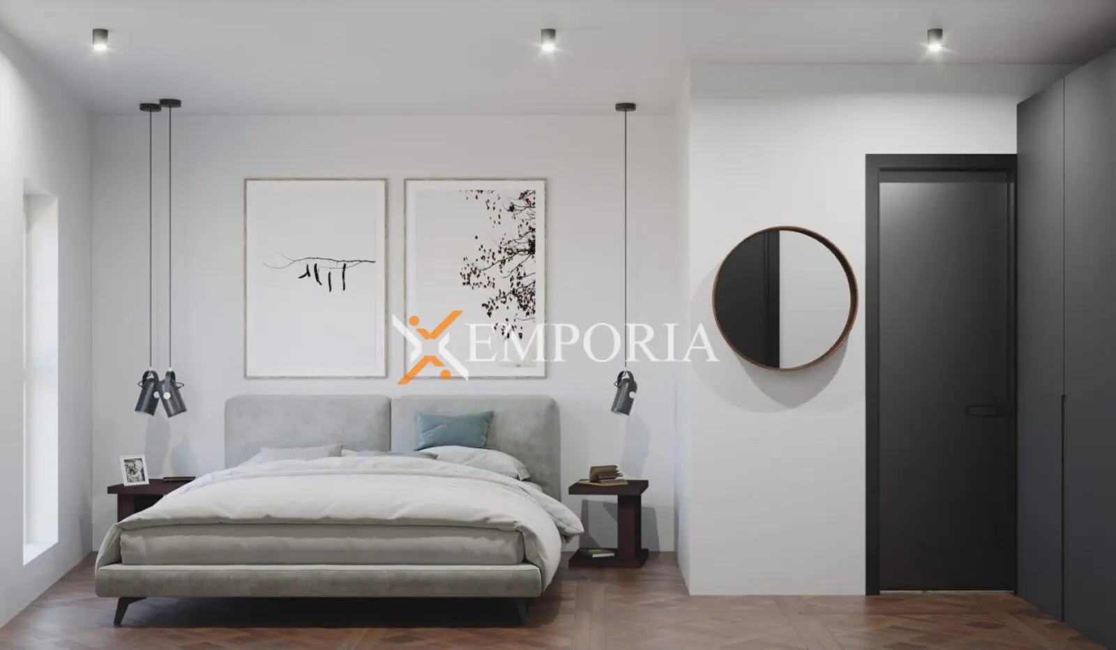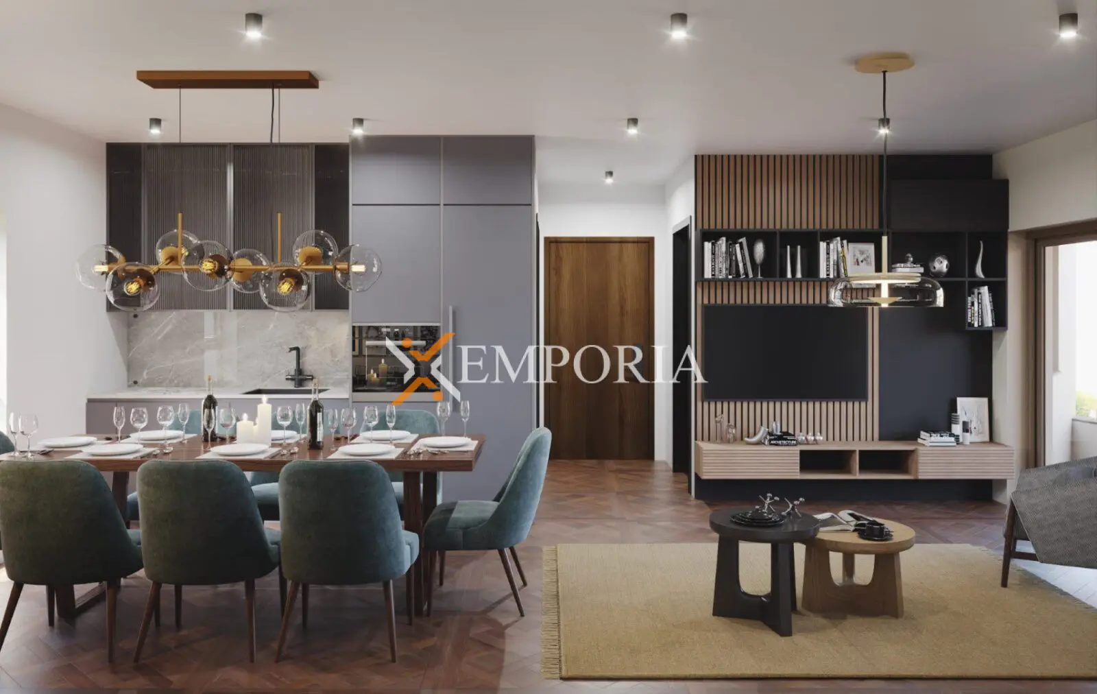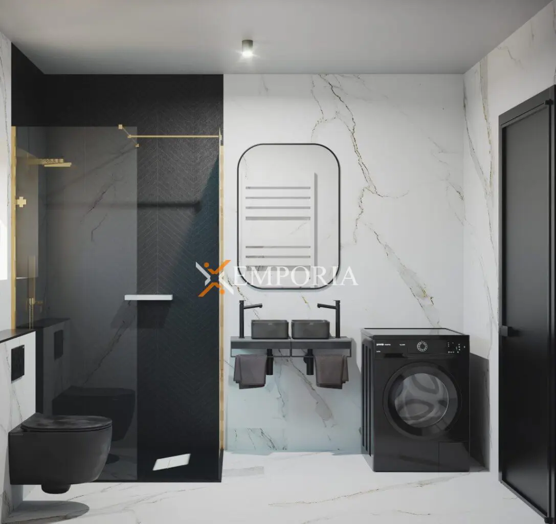 Der Bau des Gebäudes erfolgt mit Thermoziegelblöcken. Die Wärmedämmung der Fassade erfolgt mit 10 cm dickem Styropor. Die Bodenbeläge sind Fliesen. Die Fenster bestehen aus PVC-Material mit dreischichtigem Glas, Moskitonetzen und Aluminium Rolläden. Elektrische Fußbodenheizung in den Badezimmern. Es werden zwei Klimaanlagen installiert. Zusätzlich verfügt die Wohnung auch über einen Schornstein. Darüber hinaus ist die Eingangstür einbruchsicher und feuersicher.