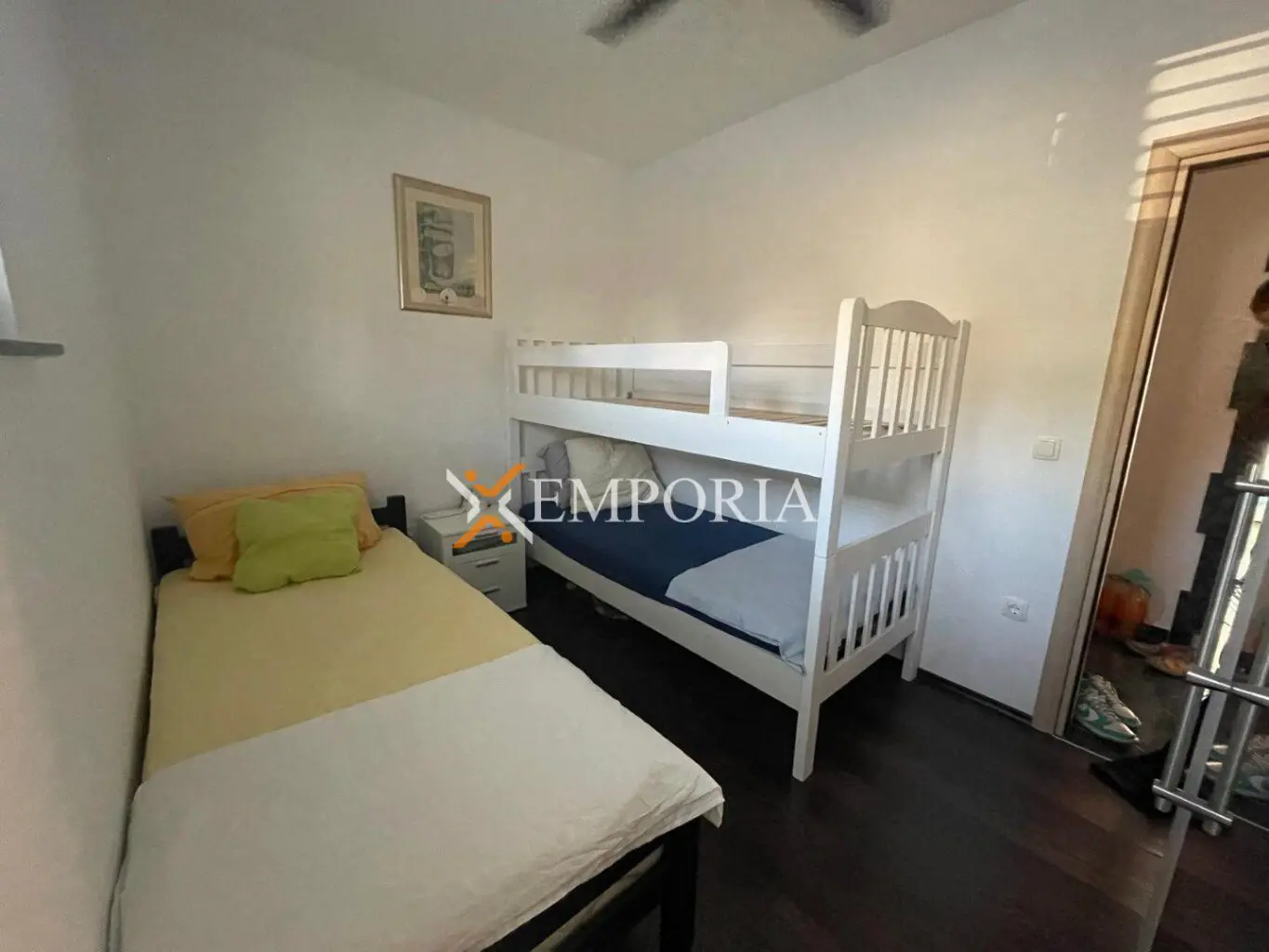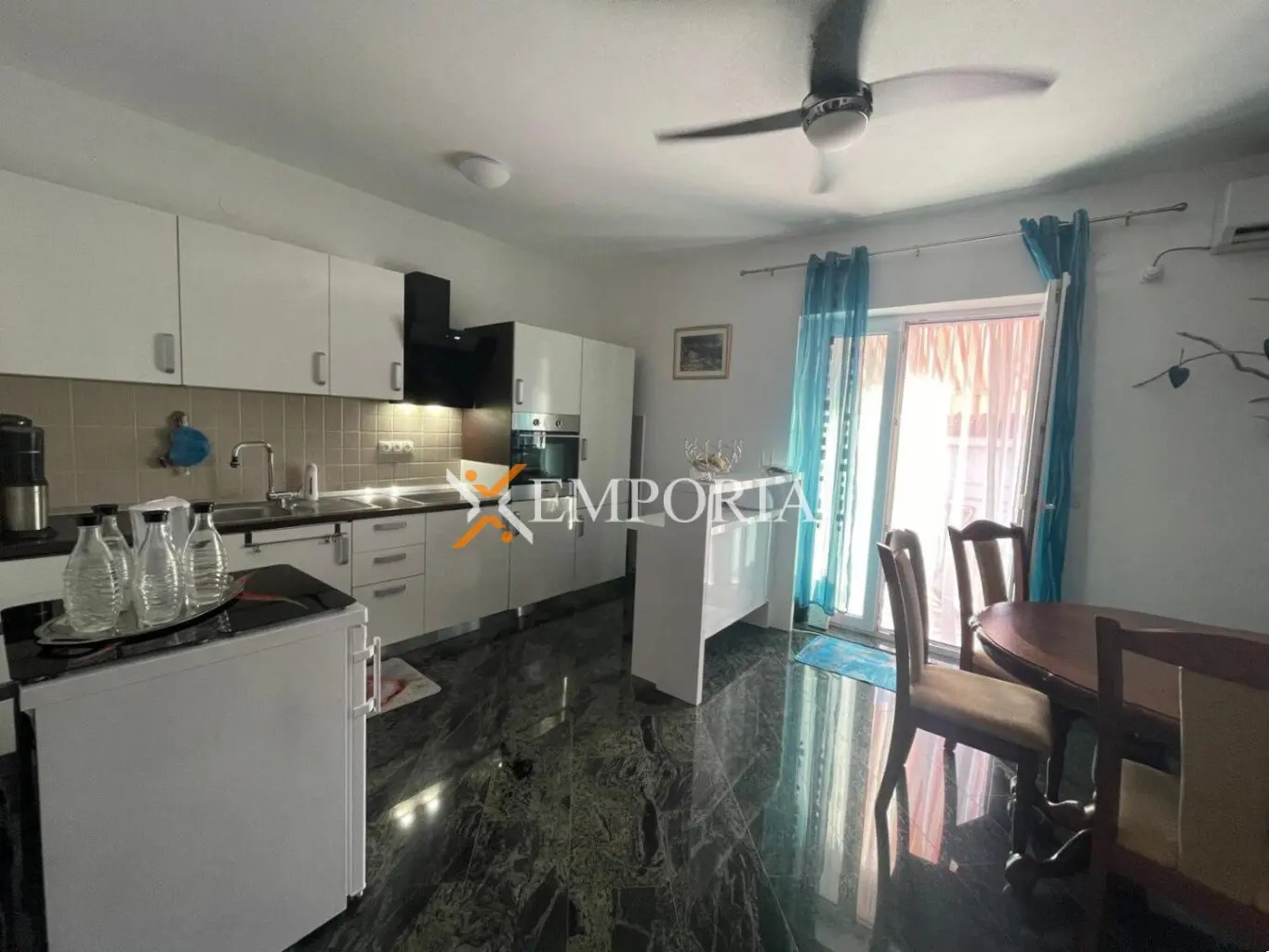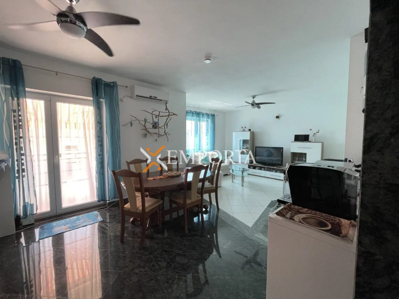 Zum Verkauf steht eine komplett möblierte Wohnung im oberen Erdgeschoss eines kleineren Wohngebäudes. Diese befindet sich in Rtina, in toller Lage, nahe dem Meer und dem Strand.