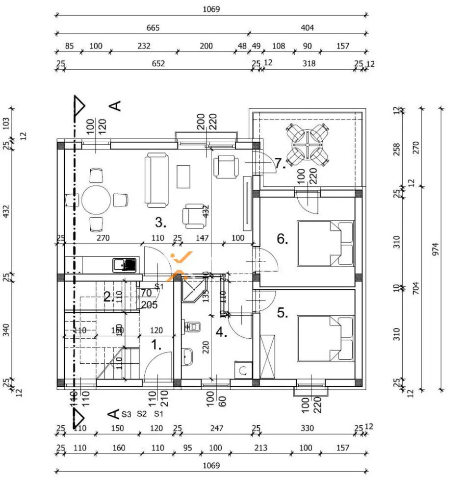 Dies ist eine Wohnung im Erdgeschoss des Gebäudes. Die Raumaufteilung besteht aus einem Badezimmer, zwei Schlafzimmern, einer Küche mit Esszimmer und Wohnzimmer sowie einer überdachten Terrasse. Die Nettonutzfläche der beschriebenen Räumlichkeiten beträgt 61,84 m2.
