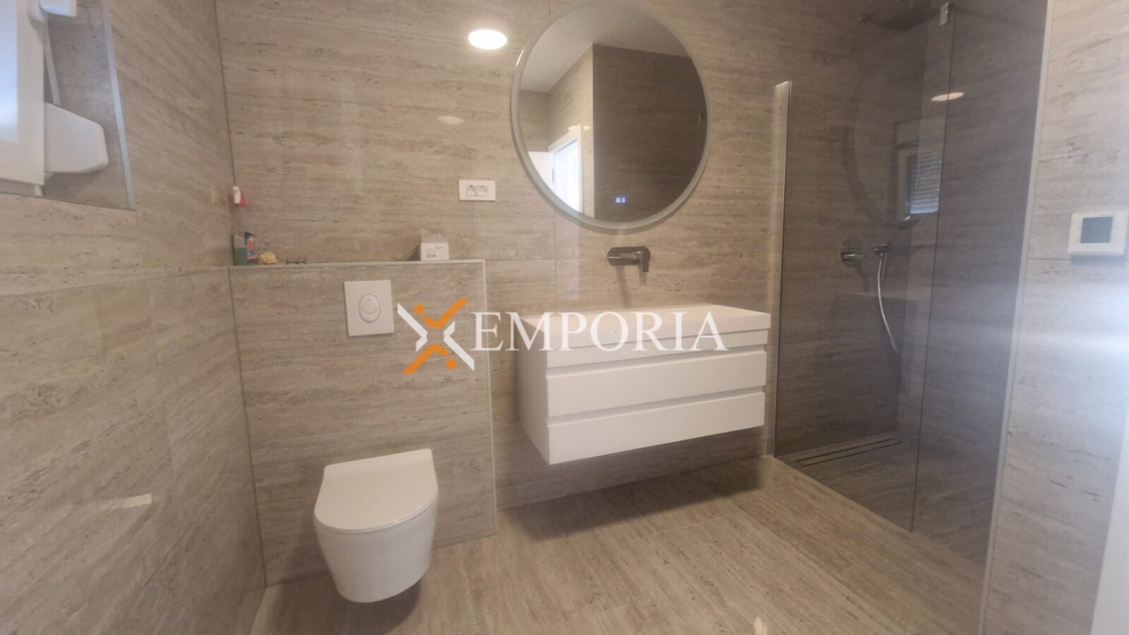 Der Bau des Gebäudes erfolgt mit gemauerten Thermoblöcken. Die Wärmedämmung der Fassade besteht aus 10 cm Styropor. Die Bodenbeläge sind Laminat und Fliesen. Die Fenster bestehen aus PVC-Material mit Rollläden und Moskitonetzen. Klimaanlagen im Wohn- und in den Schlafzimmern. Darüber hinaus gibt es elektrische Fußbodenheizung in den Bädern. Weiters ist die Eingangstür der Wohnung einbruch- und feuersicher.