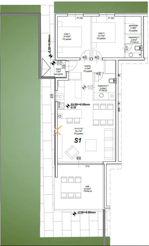 Zusätzlich gehört zur Wohnung ein Garten von 132,97 m2 und ein Parkplatz vor dem Gebäude. Die Gesamtnettofläche der Wohnung mit allen Zusatzteilen beträgt 100,09 m2.