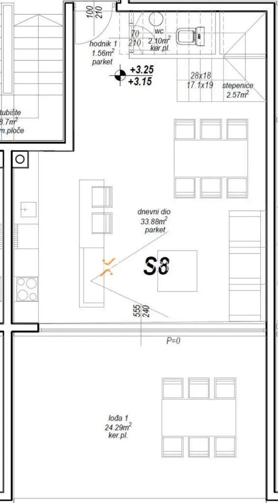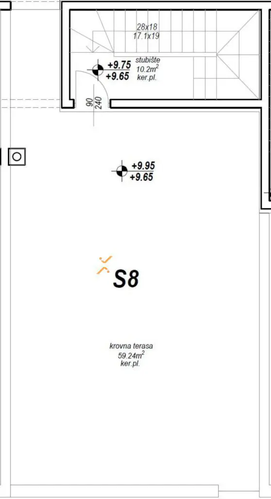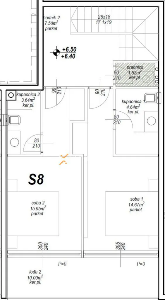 Die Raumaufteilung im 1. Stock umfasst einen Flur, WC, eine Küche mit Essbereich und Wohnzimmer sowie eine Loggia. Eine innere Treppe führt in den 2. Stock, wo sich ein Flur, zwei Schlafzimmer mit eigenem Bad, eine Wäscherei und eine Loggia befinden. Innere Treppen führen weiter auf die Dachterrasse mit einer Fläche von 59,24 m2. Die Nettofläche der beschriebenen Räume beträgt 127,49 m2.