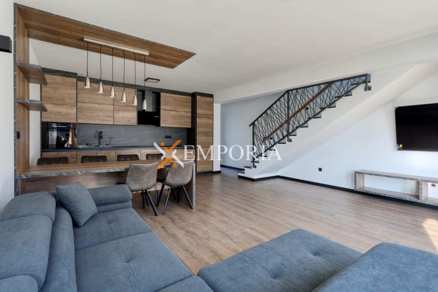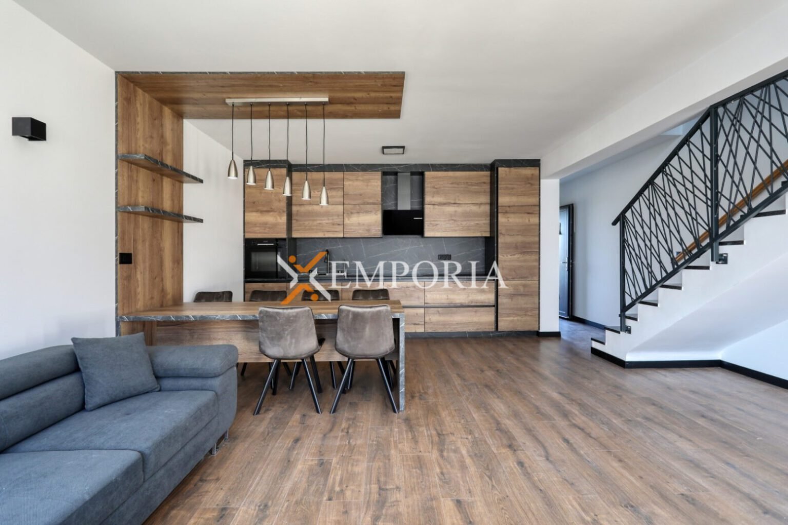 Die Wohnung erstreckt sich über das Erdgeschoss und das erste Obergeschoss. Im Erdgeschoss befinden sich ein überdachter Eingang, ein Flur, ein Badezimmer, ein Waschraum, ein Wohnzimmer mit Küche und Essbereich. Eine Innentreppe führt ins erste Obergeschoss, wo sich drei Schlafzimmer und ein Badezimmer befinden. Die Netto-Nutzfläche der Wohnung beträgt 99,74 m2.