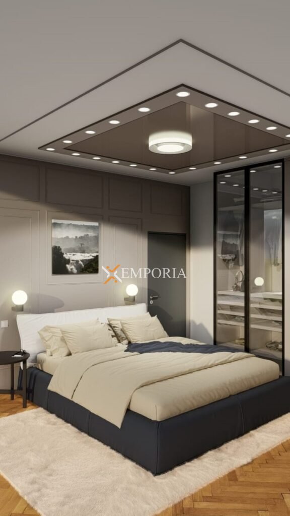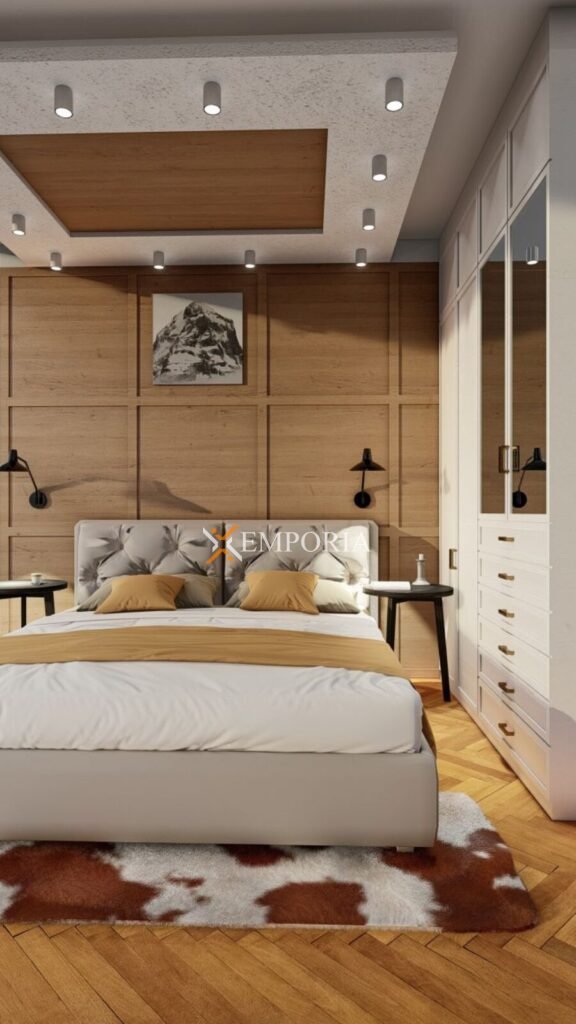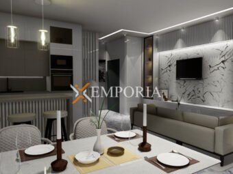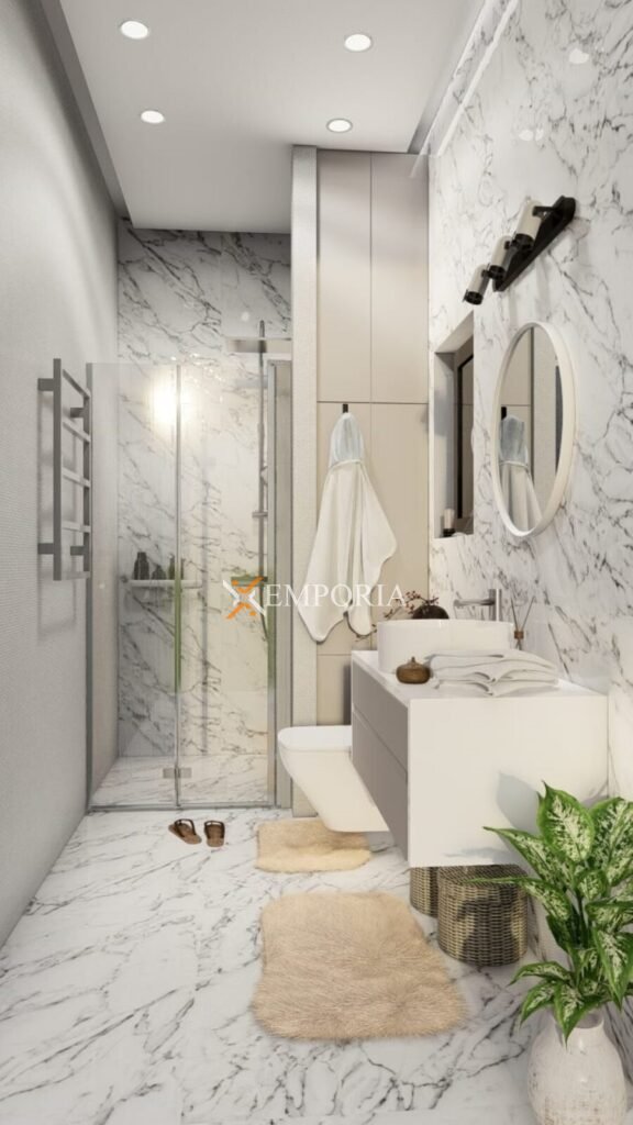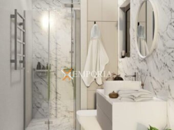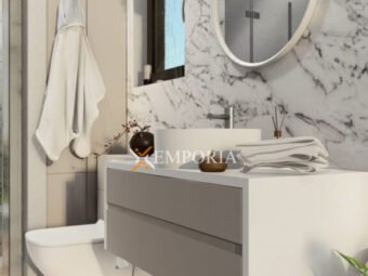 Die Raumaufteilung umfasst einen Flur, drei Schlafzimmer – eines davon mit eigenem Bad –, ein zusätzliches Badezimmer, ein separates WC, eine Küche mit Ess- und Wohnbereich sowie eine überdachte Terrasse von 92,90 m². Über das Treppenhaus gelangt man zur privaten Dachterrasse von 57 m². Zur Wohnung gehört ein Parkplatz.