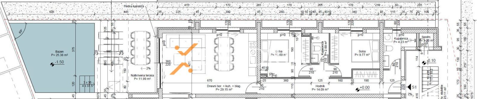 Das Gebäude wird hauptsächlich aus Betonwänden und teilweise aus Thermoziegeln errichtet. Im Außenbereich ist ein gemauerter Grill vorgesehen.