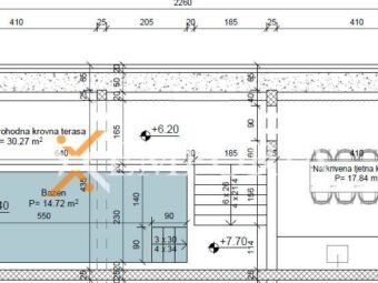 Das Gebäude wird hauptsächlich aus Betonwänden und teilweise aus Thermoziegeln errichtet. Auf der Dachterrasse befindet sich ein gemauerter Grill.