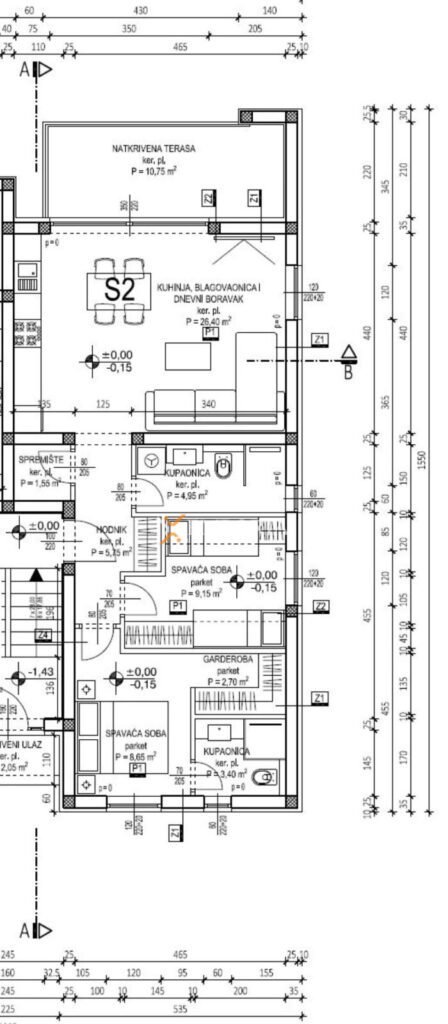 Die Raumaufteilung umfasst einen Flur, zwei Schlafzimmer – eines davon mit eigenem Bad und Ankleide – ein weiteres Badezimmer, einen Abstellraum sowie eine Küche mit Ess- und Wohnzimmer. Vom Wohnbereich aus gelangt man auf eine teilweise überdachte Terrasse. Die Netto-Wohnfläche beträgt 72,95 m², während die Gesamtfläche inklusive aller Nebenflächen 81,66 m² beträgt. Zur Wohnung gehören ein privater Garten mit 59,67 m² und ein Parkplatz.