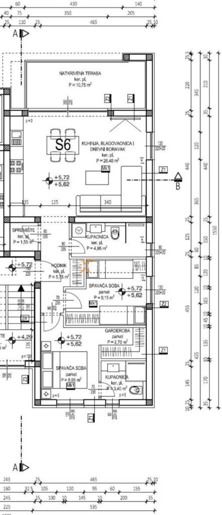 Die Raumaufteilung umfasst einen Flur, zwei Schlafzimmer – eines davon mit eigenem Bad und begehbarem Kleiderschrank – ein zusätzliches Badezimmer, eine Küche mit Ess- und Wohnzimmer, einen Abstellraum und eine überdachte Terrasse.