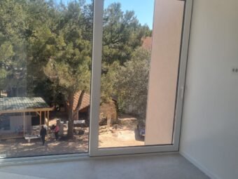 Die Wohnung ist mit Ziegelblock gebaut, die Renovierung umfasst PVC-Fenster mit Dreifachverglasung, elektrische Rollläden und Insektenschutzgitter. Die Eingangstür ist einbruchsicher und feuerfest, die Fassade mit 7 cm Styropor gedämmt. Die Böden sind mit Vinyl ausgelegt. Für Wärme sorgt eine elektrische Fußbodenheizung in den Bädern, außerdem gibt es drei Klimaanlagen – im Wohnzimmer und in beiden Schlafzimmern. Die Entwässerung ist an die öffentliche Kanalisation angeschlossen.