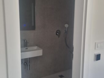 Die Wohnung ist mit Ziegelblock gebaut, die Renovierung umfasst PVC-Fenster mit Dreifachverglasung, elektrische Rollläden und Insektenschutzgitter. Die Eingangstür ist einbruchsicher und feuerfest, die Fassade mit 7 cm Styropor gedämmt. Die Böden sind mit Vinyl ausgelegt. Für Wärme sorgt eine elektrische Fußbodenheizung im Badezimmer, außerdem gibt es zwei Klimaanlagen – im Wohnzimmer und im Schlafzimmer. Die Entwässerung ist an die öffentliche Kanalisation angeschlossen.