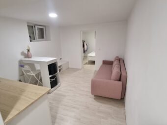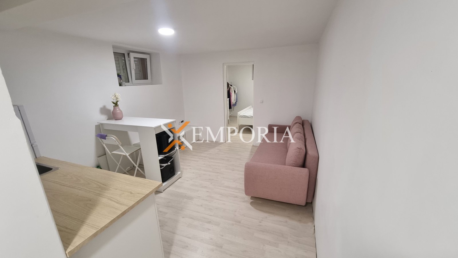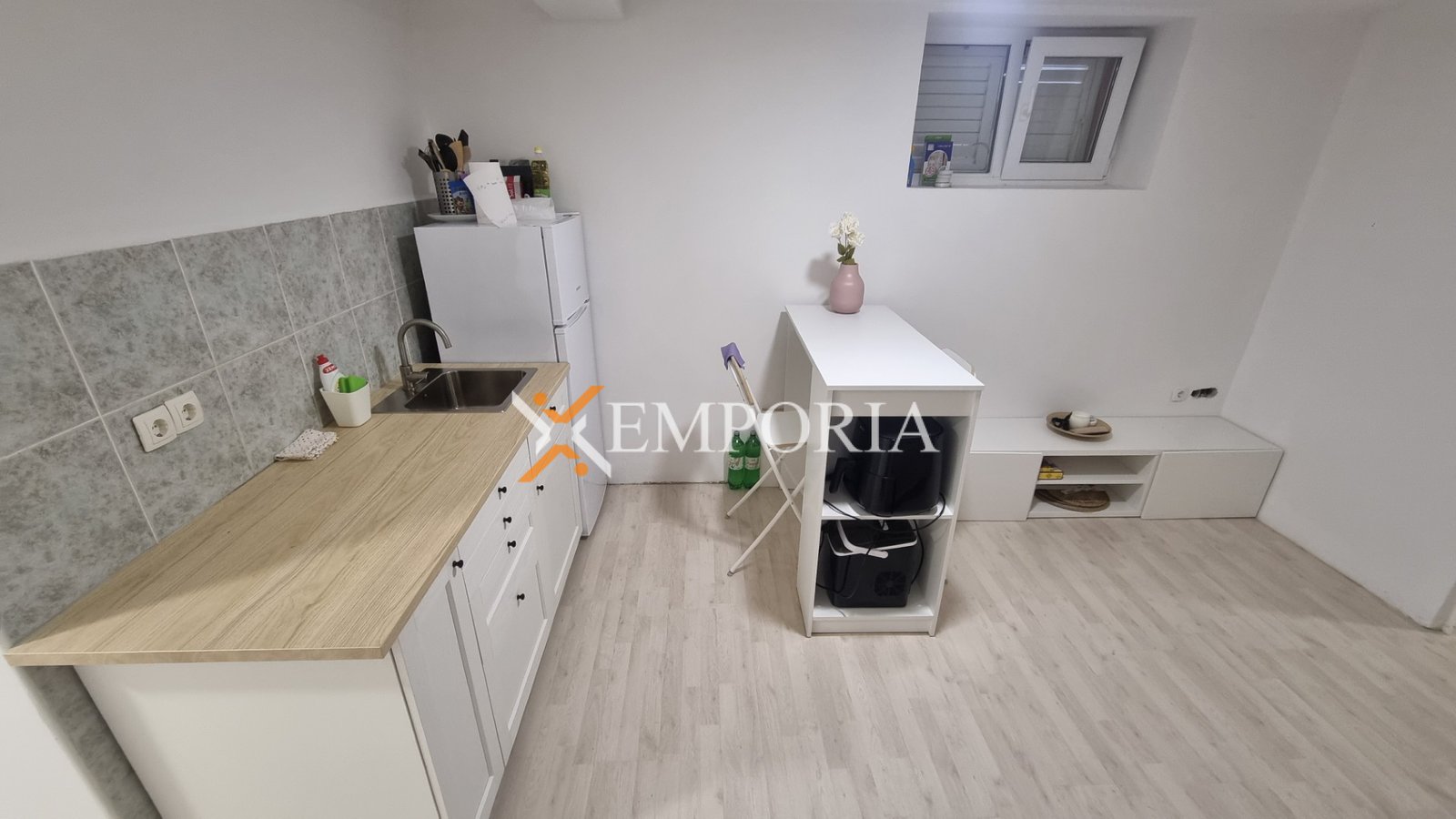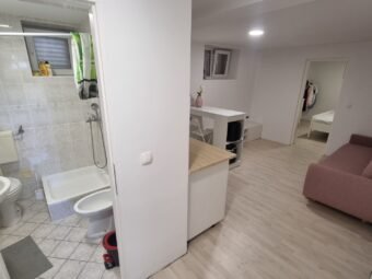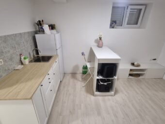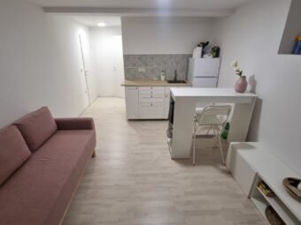 Die Wohnung befindet sich im Kellergeschoss des Gebäudes und verfügt über eine Nettofläche von 29,38 m². Die Raumaufteilung umfasst Eingang, Küche mit Ess- und Wohnzimmer, Badezimmer und Schlafzimmer. Außerdem gehört ein Außenparkplatz dazu. Die Gesamtfläche mit Zubehör beträgt 32,38 m².