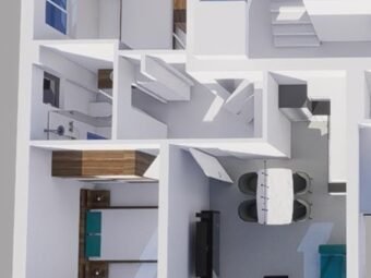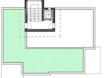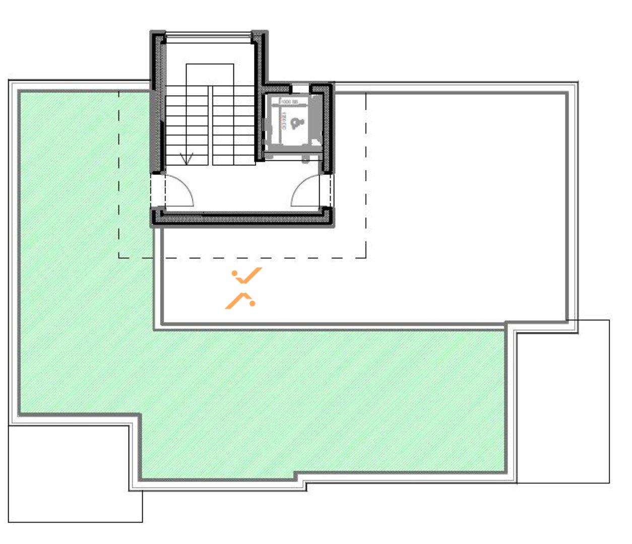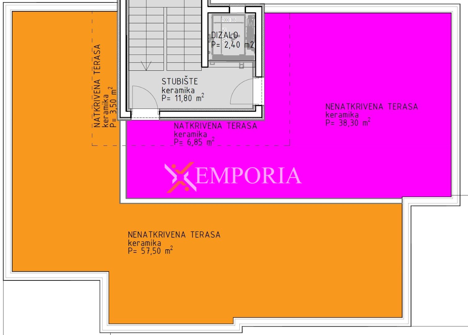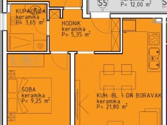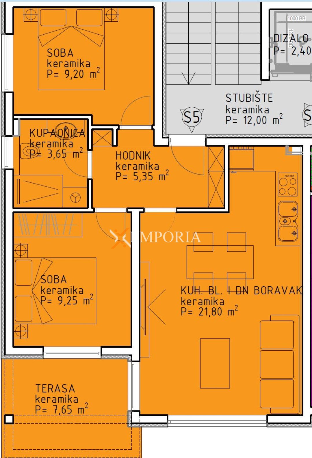 Die Wohnung befindet sich im zweiten Stock eines modernen Gebäudes mit einem Aufzug, der vom Untergeschoss bis zu den Dachterrassen führt. Die Raumaufteilung umfasst einen Flur, zwei Schlafzimmer, ein Badezimmer sowie eine Küche mit Essbereich und Wohnzimmer mit Zugang zu einer überdachten Terrasse. Die Nettofläche des Wohnbereichs inklusive der überdachten Terrasse beträgt 53,08 m². Über das Treppenhaus gelangt man auf die private Dachterrasse mit einer Gesamtfläche von 61 m², davon sind 3,50 m² überdacht, was einen außergewöhnlichen Außenbereich bietet. Die Netto-Nutzfläche der beschriebenen Räume beträgt 69,21 m².