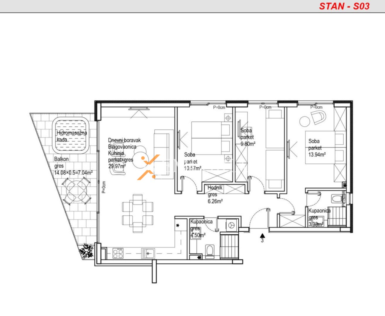 Die Wohnung verfügt über eine funktionale Raumaufteilung bestehend aus einem Eingangsbereich, zwei Schlafzimmern, einem Schlafzimmer mit eigenem Badezimmer, einem weiteren Badezimmer sowie einer Küche mit Essbereich und offenem Wohnraum. Vom Wohnbereich aus gelangt man auf eine überdachte Terrasse, die sich ideal für entspannte Stunden im Freien eignet. Die Nettonutzfläche der beschriebenen Räume beträgt 85,46 m², während die gesamte Nettofläche inklusive Zubehör 88,01 m² umfasst. Zur Wohnung gehört ein Parkplatz.