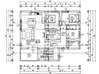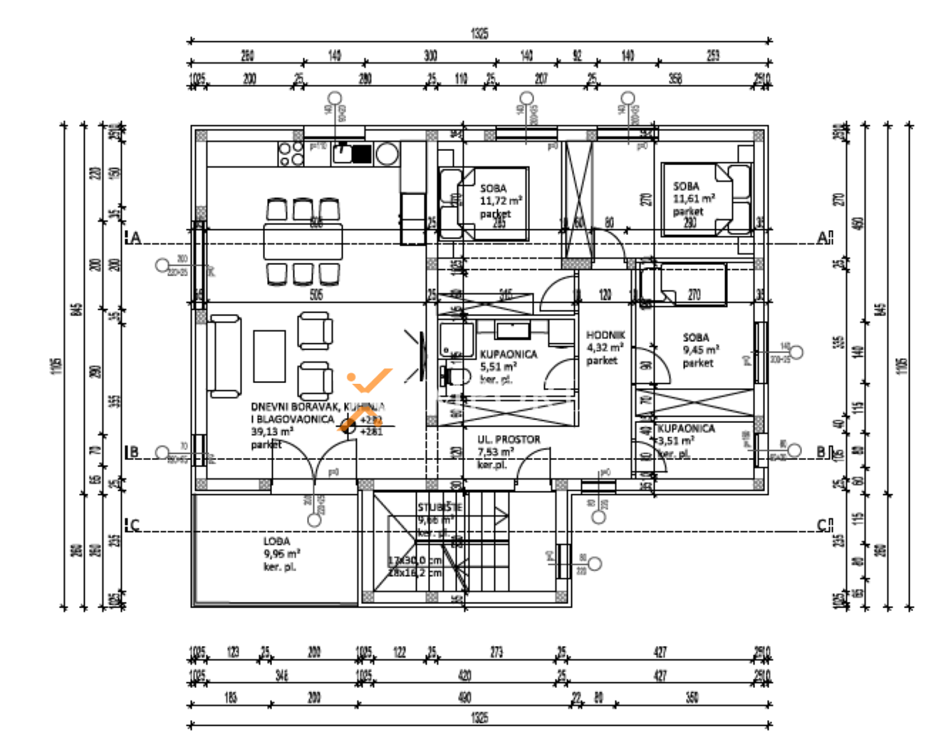 Die Raumaufteilung umfasst einen Eingangsbereich mit Flur, drei Schlafzimmer, zwei Badezimmer, ein Wohnzimmer mit Essbereich und Küche im offenen Konzept sowie eine überdachte Terrasse. Die Netto-Nutzfläche der beschriebenen Räume beträgt 97,75 m2, während die gesamte Nettofläche inklusive Nebenflächen 105,25 m2 beträgt. Zur Wohnung gehören zwei Parkplätze, was zusätzlichen Komfort und Mehrwert bietet.