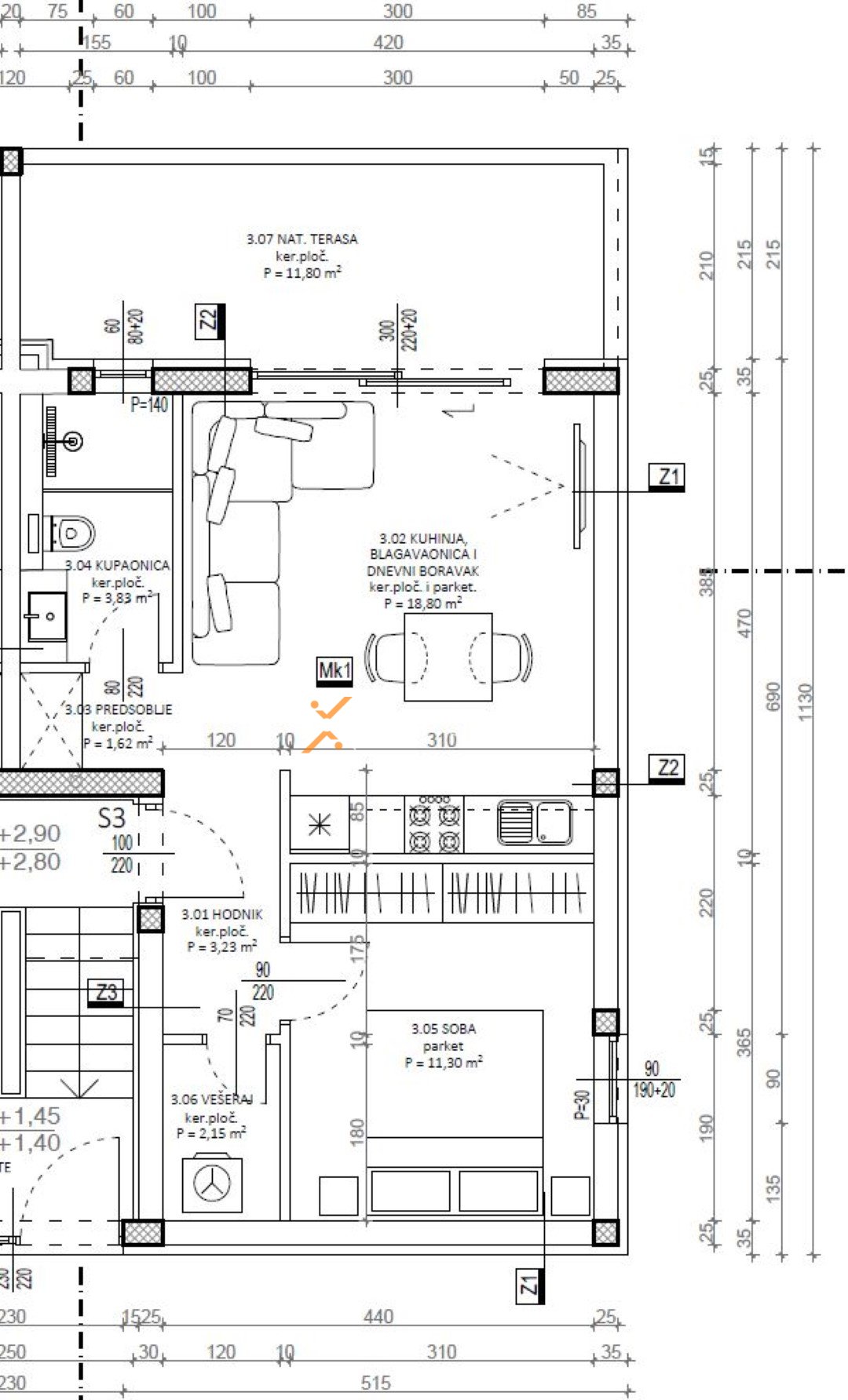Die Wohnung befindet sich im 1. Stock und verfügt über einen funktionalen Grundriss mit Flur, einem Schlafzimmer, einem Badezimmer, einem Hauswirtschaftsraum, einer Küche mit Essbereich und Wohnzimmer im offenen Konzept sowie einer überdachten Terrasse. Die Netto-Nutzfläche der beschriebenen Räume beträgt 46,83 m2, während die gesamte Nettofläche inklusive Nebenflächen 49,33 m2 umfasst. Zur Wohnung gehört ein Parkplatz.