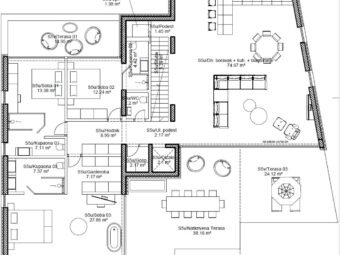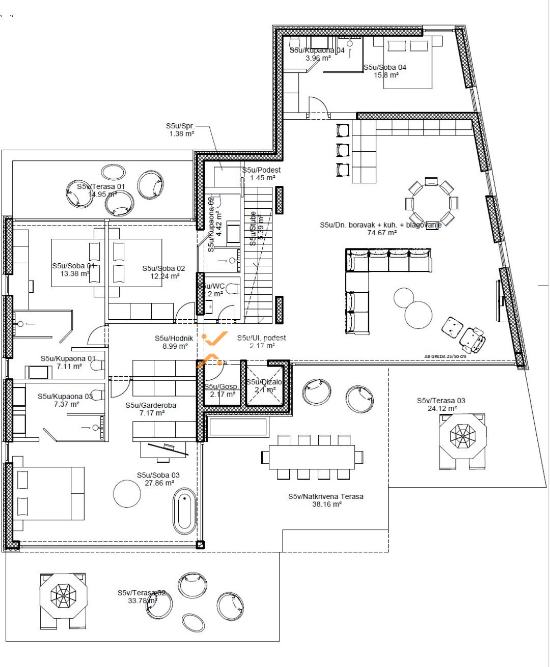 Das Penthouse befindet sich im 2. Stock und überzeugt durch einen großzügigen und hochwertigen Grundriss. Der Innenbereich umfasst einen Flur, drei Schlafzimmer mit jeweils eigenem Badezimmer, ein weiteres Schlafzimmer mit eigenem Badezimmer und Ankleideraum, ein separates WC, einen Hauswirtschaftsraum, eine Küche mit Essbereich und Wohnzimmer im offenen Konzept, drei nicht überdachte Terrassen sowie eine überdachte Terrasse. Die Netto-Nutzfläche des Wohnbereichs beträgt 248,76 m2, während die Dachterrassen ca. 185 m2 umfassen, davon sind 21,48 m2 überdacht. Die gesamte Netto-Nutzfläche der beschriebenen Räume beträgt 300,04 m2, während die Gesamtfläche inklusive Nebenflächen 337,00 m2 umfasst.