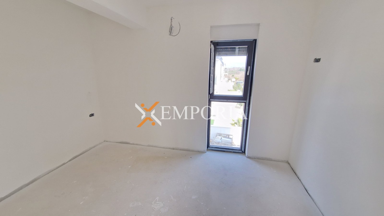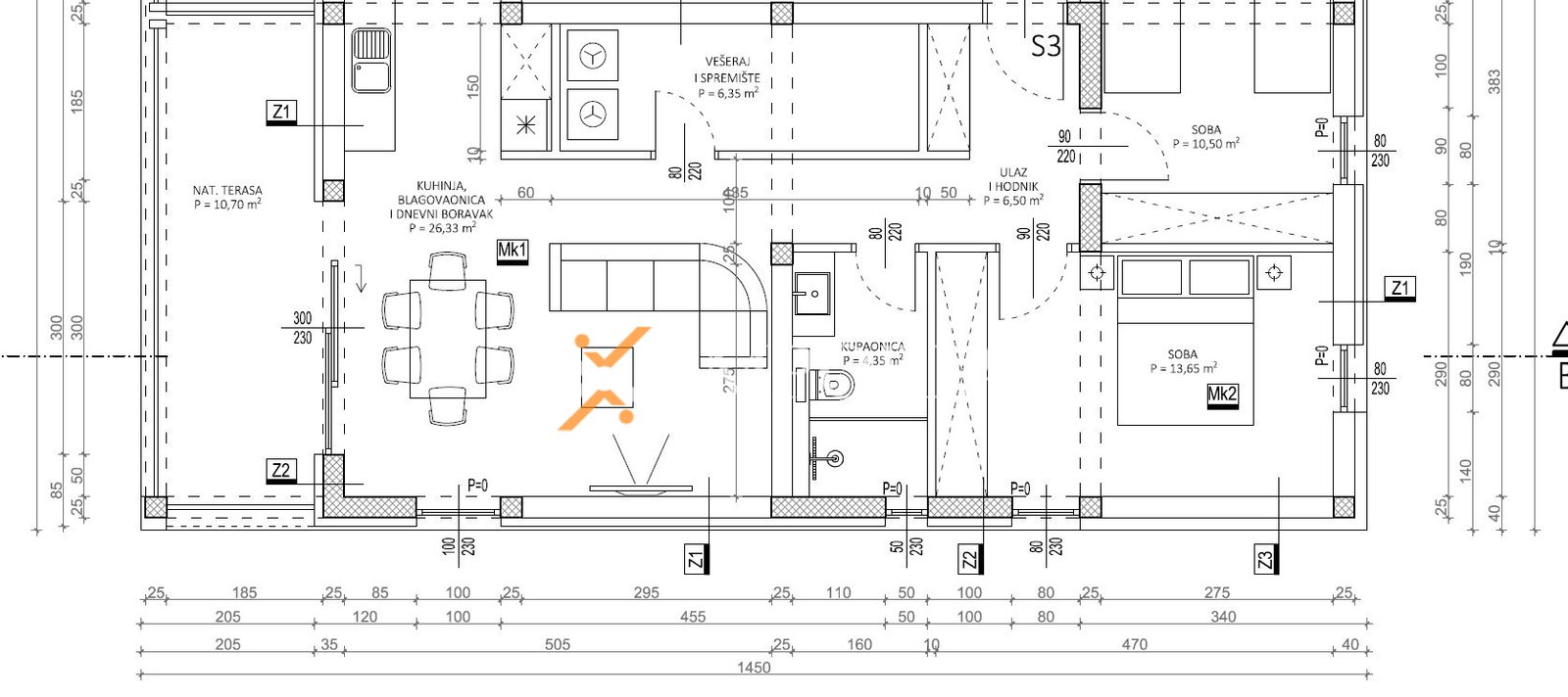 Die Wohnung befindet sich im ersten Stock und besteht aus einem Flur, zwei Schlafzimmern, einem Badezimmer, einem Hauswirtschaftsraum, einer offenen Küche mit Essbereich und Wohnzimmer sowie einer überdachten Terrasse. Die Nettonutzfläche der beschriebenen Räume beträgt 73,03 m2. Zusätzlich gehören zwei Parkplätze zur Wohnung, daher beträgt die gesamte Nettonutzfläche mit Zubehör 78,23 m2.