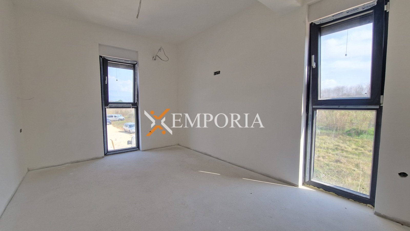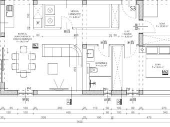 PVC-Fenster mit Dreifachverglasung bieten eine hervorragende Wärme- und Schalldämmung. An den Glaswänden sind elektrische Rollläden angebracht, während an den übrigen Fenstern Rollläden und Insektenschutzgitter installiert sind. Die Eingangstür ist einbruchhemmend und feuerbeständig, und das Dach ist neu, flach und aus Beton gefertigt. Die Bodenbeläge bestehen aus hochwertigen Fliesen und Laminat, was den modernen Charakter des Innenraums zusätzlich unterstreicht.