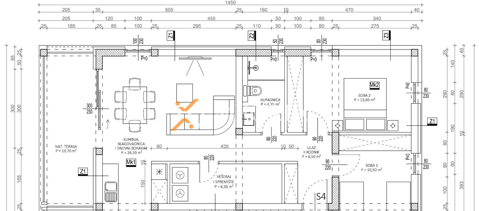 Die Wohnung besteht aus einem Flur, zwei Schlafzimmern, einem Badezimmer, einem Hauswirtschaftsraum, einer offenen Küche mit Essbereich und Wohnzimmer sowie einer überdachten Terrasse. Die Nettonutzfläche der geschlossenen Räume beträgt 73,03 m2. Zusätzlich gehören zwei Parkplätze zur Wohnung, daher beträgt die gesamte Nettonutzfläche mit Zubehör 78,23 m2.