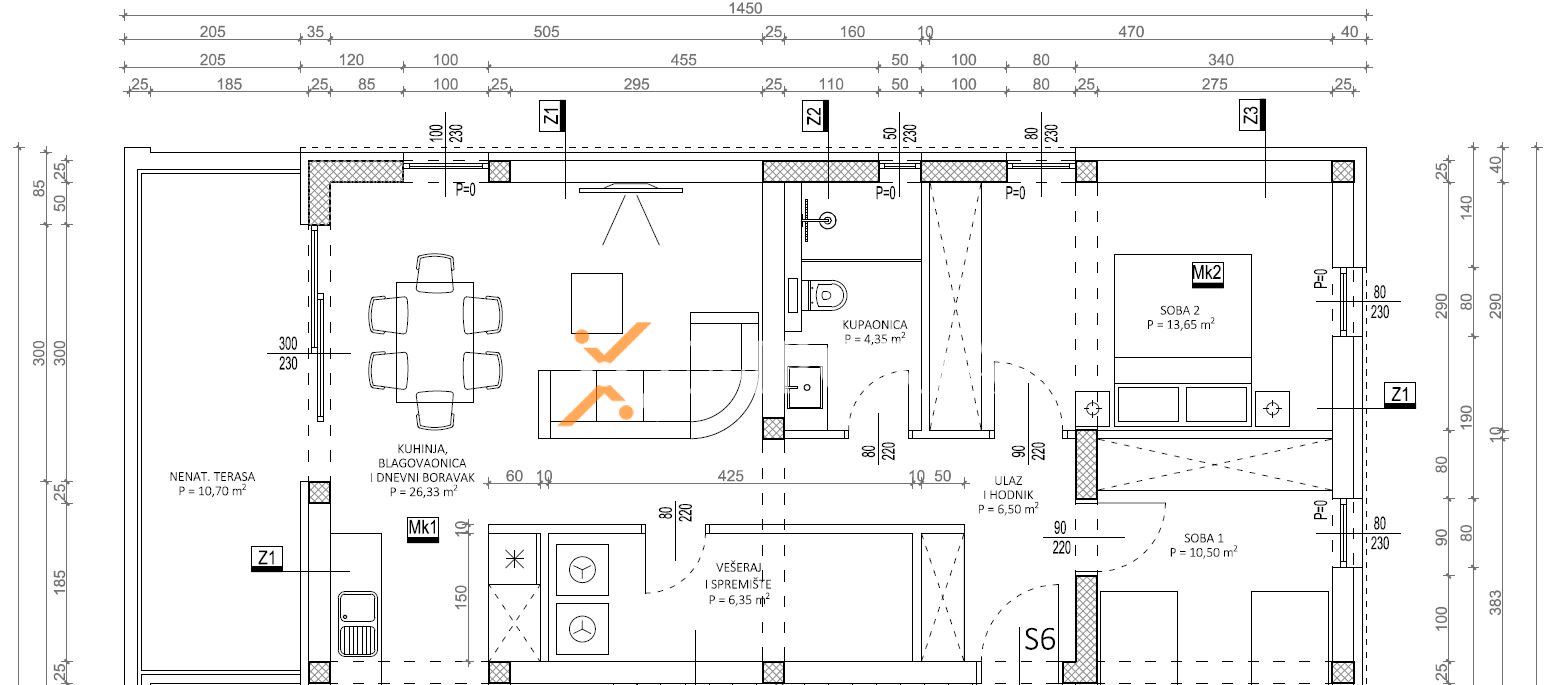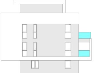 Die Wohnung befindet sich im zweiten Stock und besteht aus einem Flur, zwei Schlafzimmern, einem Badezimmer, einem Hauswirtschaftsraum, einer offenen Küche mit Essbereich und Wohnzimmer sowie einer nicht überdachten Terrasse. Die Nettonutzfläche des Innenbereichs mit Terrasse beträgt 70,35 m2. Über das Treppenhaus gelangt man auf die großzügige Dachterrasse mit einer Fläche von 71,49 m2, die teilweise überdacht ist.