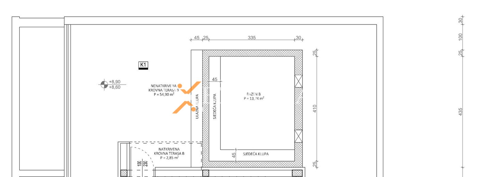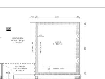 Auf der Dachterrasse befindet sich ein Pool mit einer Fläche von 13,74 m2, wobei 3,43 m2 gemäß Koeffizient in die Nettonutzfläche eingerechnet sind. Die Nettonutzfläche der beschriebenen Räume beträgt 88,94 m2. Zur Wohnung gehören zwei Parkplätze, daher beträgt die gesamte Nettonutzfläche mit Zubehör 94,14 m2.