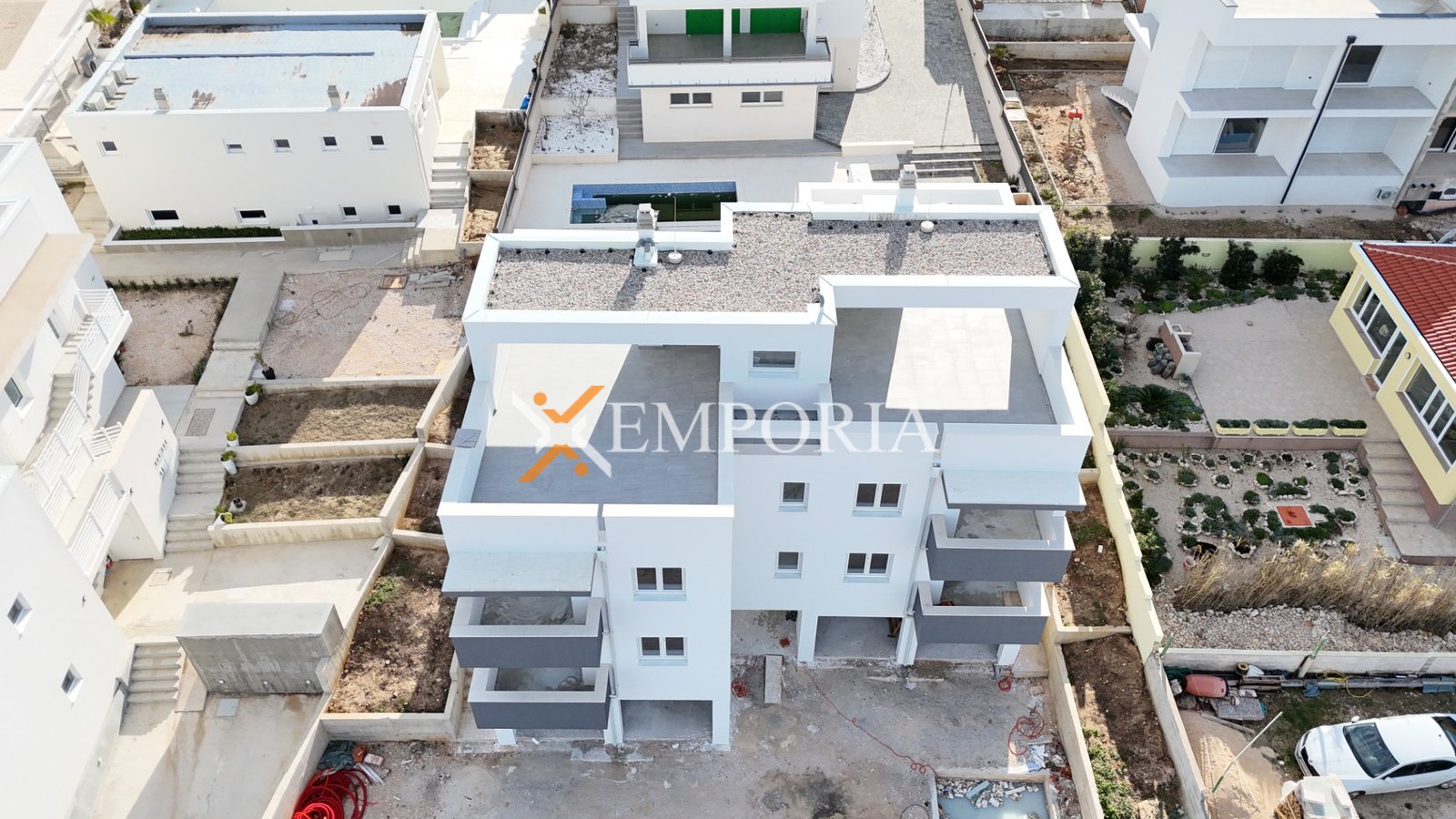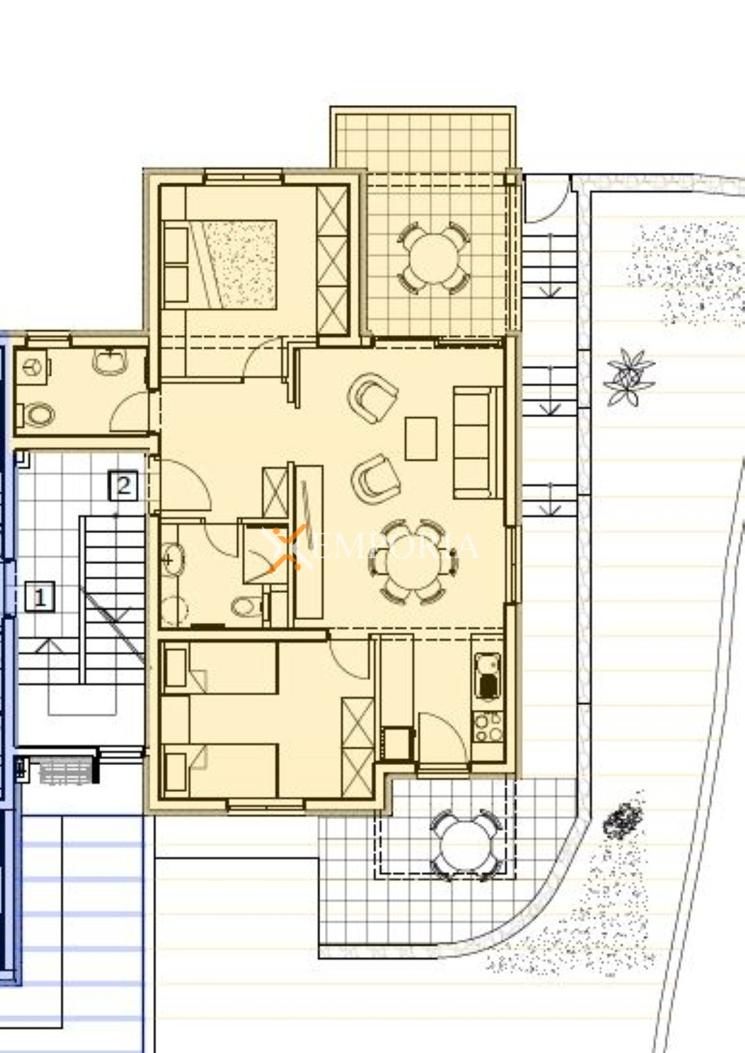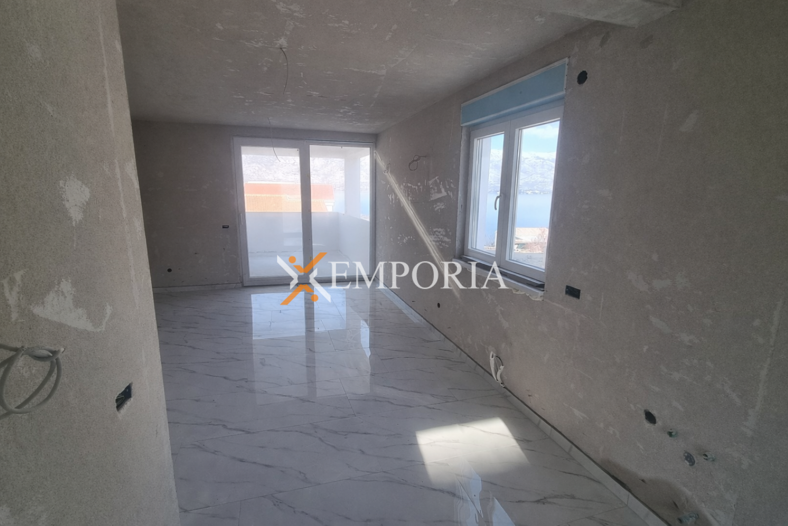 Die Wohnung besteht aus einem Flur, zwei Schlafzimmern, einem Badezimmer, zusätzlichem WC, einer Küche mit Essbereich und Wohnzimmer, einer Loggia sowie einer teilweise überdachten Terrasse. Die Netto-Nutzfläche der beschriebenen Räume beträgt 70,85 m2. Von der Loggia aus bietet sich ein hervorragender Meerblick.