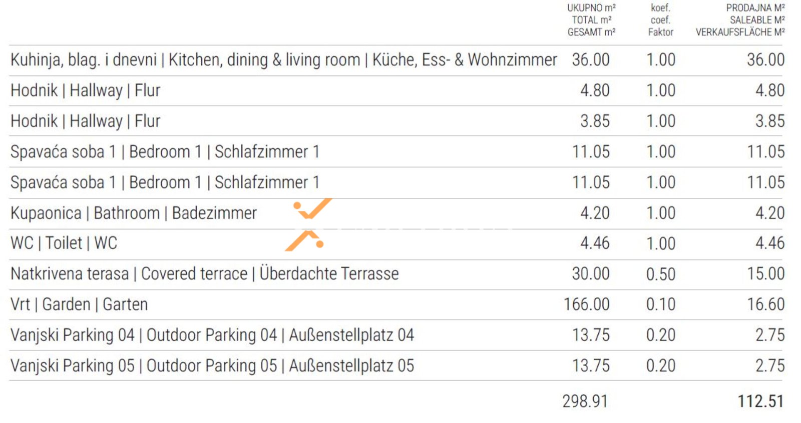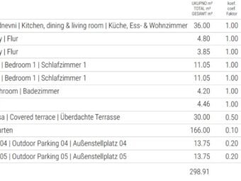 Die Raumaufteilung umfasst einen Flur, zwei Schlafzimmer, ein Badezimmer, ein separates WC, eine offene Küche mit Essbereich und Wohnzimmer sowie eine überdachte Terrasse. Die Nettonutzfläche der Innenräume beträgt 90,41 m2. Zur Wohnung gehört ein großzügiger privater Garten mit 166,00 m2, der zusätzlichen Komfort und Privatsphäre bietet, sowie zwei Stellplätze. Die gesamte Nettonutzfläche inklusive Nebenflächen beträgt 112,51 m2. Der Käufer zahlt keine Immobilienerwerbssteuer.