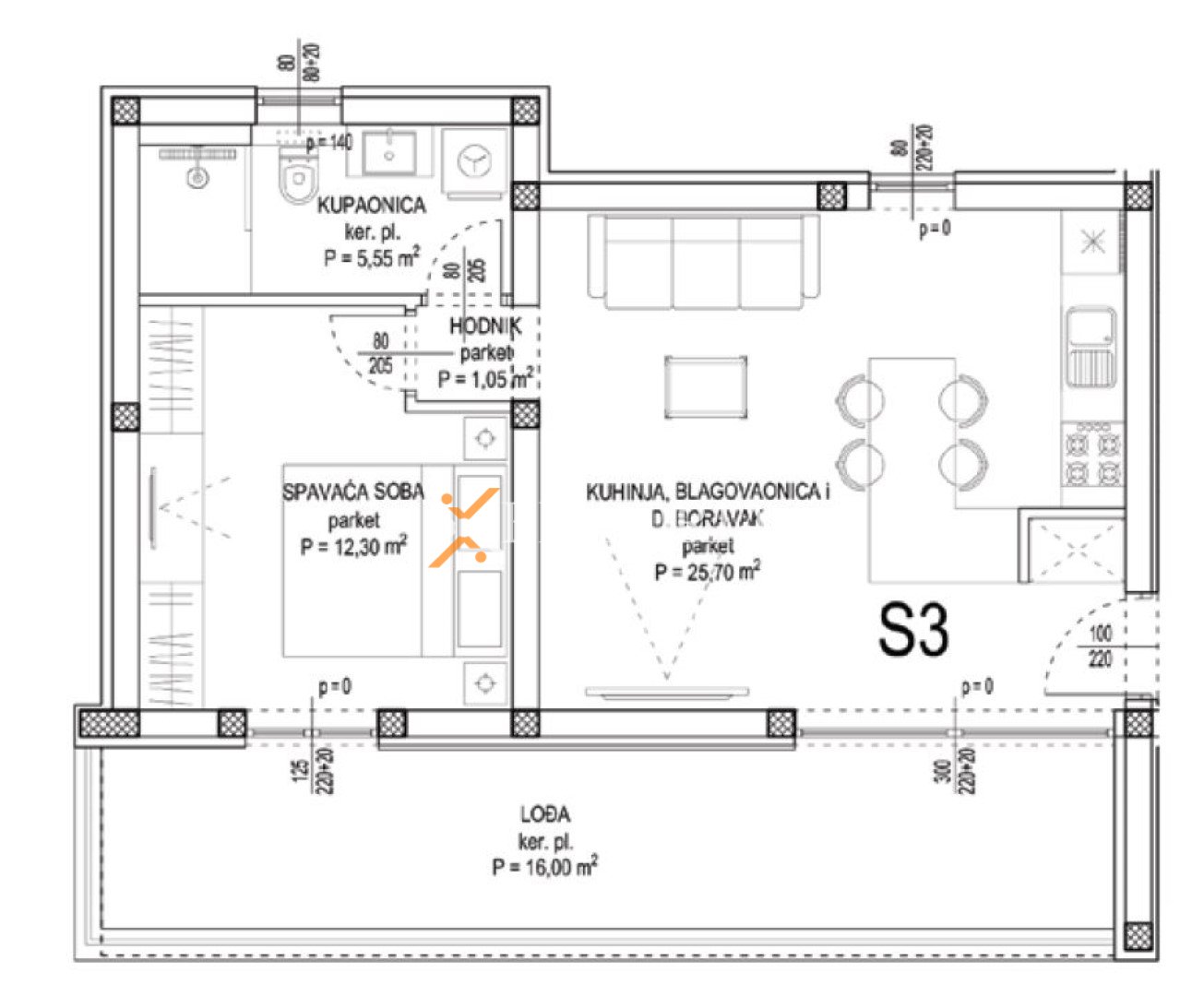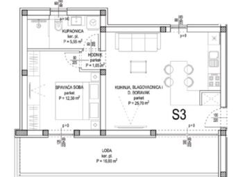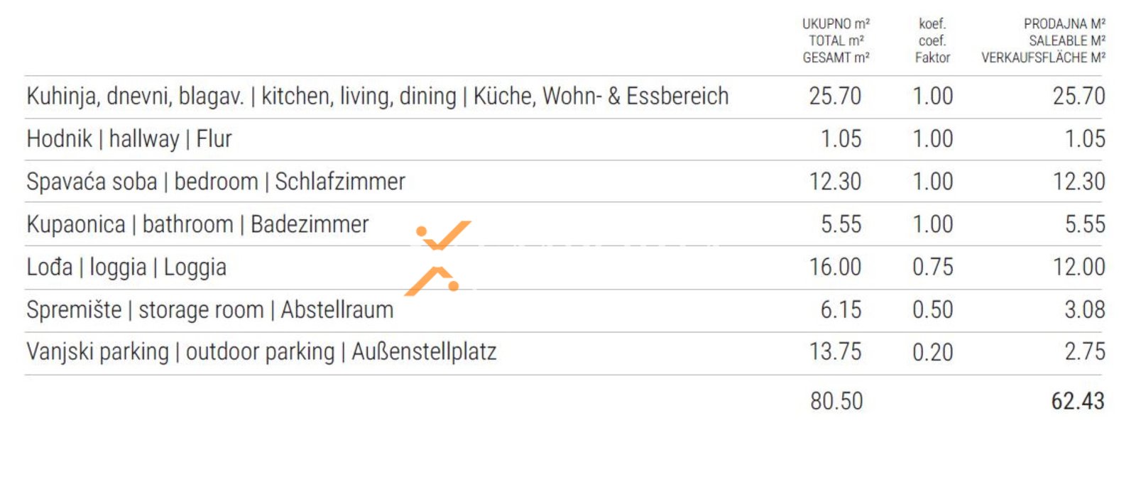 Die Raumaufteilung umfasst einen Flur, ein Schlafzimmer, ein Badezimmer, eine offene Küche mit Essbereich und Wohnzimmer sowie eine Loggia. Die Nettonutzfläche der Innenräume beträgt 56,60 m2. Zur Wohnung gehören außerdem ein Abstellraum mit 6,15 m2 im Untergeschoss sowie ein Außenstellplatz. Die gesamte Nettonutzfläche inklusive Nebenflächen beträgt 62,43 m2.