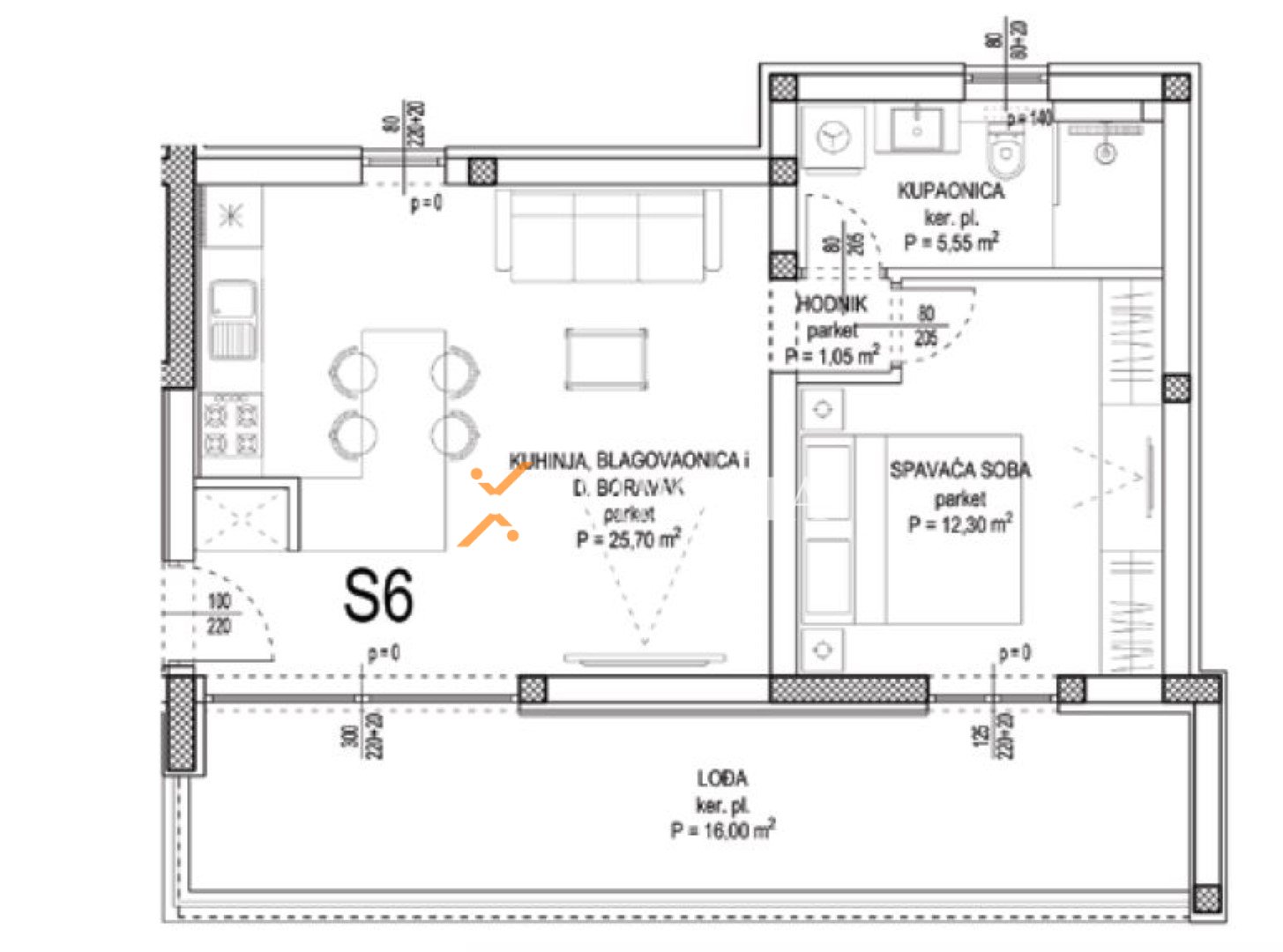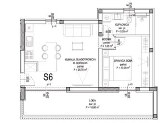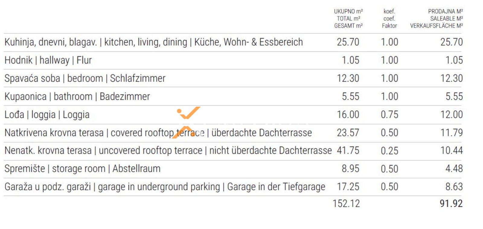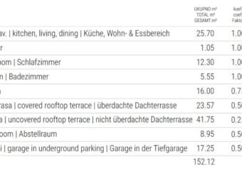 Die Raumaufteilung umfasst einen Flur, ein Schlafzimmer, ein Badezimmer, eine offene Küche mit Essbereich und Wohnzimmer sowie eine Loggia mit einer Nettonutzfläche von 56,60 m2. Über das Treppenhaus gelangt man auf die großzügige Dachterrasse mit einer Fläche von 65,10 m2, wovon 23,57 m2 überdacht sind. Die Nettonutzfläche der beschriebenen Räume beträgt 78,76 m2. Zur Wohnung gehören außerdem ein Abstellraum mit 8,95 m2 im Untergeschoss sowie ein Garagenstellplatz. Die gesamte Nettonutzfläche inklusive Nebenflächen beträgt 91,92 m2.
