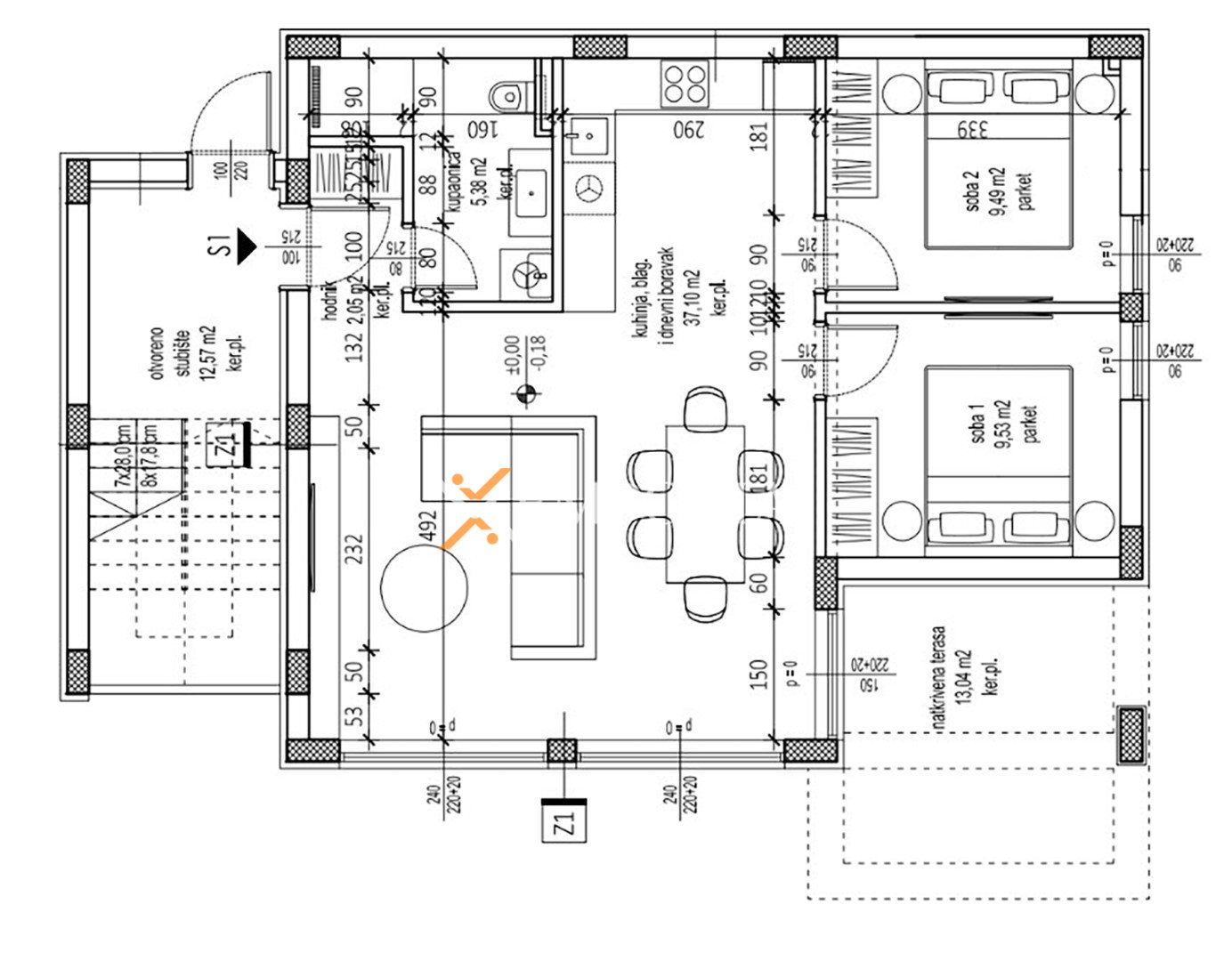 Die Wohnung besteht aus einem Flur, zwei Schlafzimmern, einem Badezimmer, einer Küche mit Essbereich und Wohnzimmer sowie einer überdachten Terrasse. Die Nettonutzfläche der Innenräume beträgt 70,07 m2. Darüber hinaus gehört zur Immobilie ein großzügiger Garten mit einer Fläche von 101,53 m2 mit einem Pool von 30,40 m2, was den Wohnkomfort und die Privatsphäre zusätzlich erhöht. Die gesamte Nettonutzfläche mit Nebenflächen beträgt 101,48 m2.