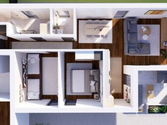 Der Grundriss ist funktional und gut aufgeteilt und umfasst einen Flur, zwei Schlafzimmer, ein Badezimmer, eine Küche mit Essbereich und Wohnzimmer sowie eine überdachte Terrasse. Die Nettonutzfläche der Wohnung beträgt 70,35 m2, während die gesamte Nettonutzfläche mit Nebenflächen 79,99 m2 beträgt.