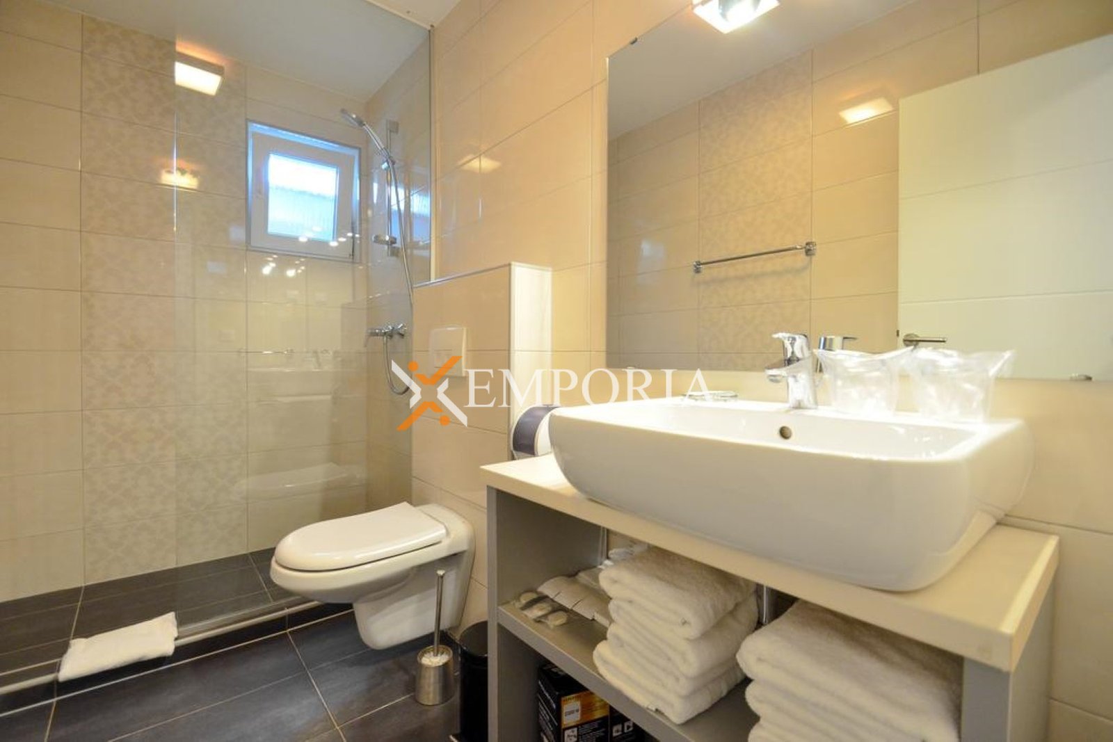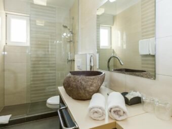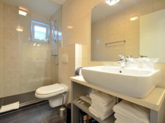 Die Heizung erfolgt über Pellet-Fußbodenheizung, während jedes Zimmer über eine Klimaanlage verfügt. Das Gebäude ist aus Ziegel-Thermoblock gebaut, während die Fassade 5 cm Styropor-Dämmung hat. Die Fenster sind PVC-Fenster mit Rollläden, und die Böden sind mit Fliesen belegt.