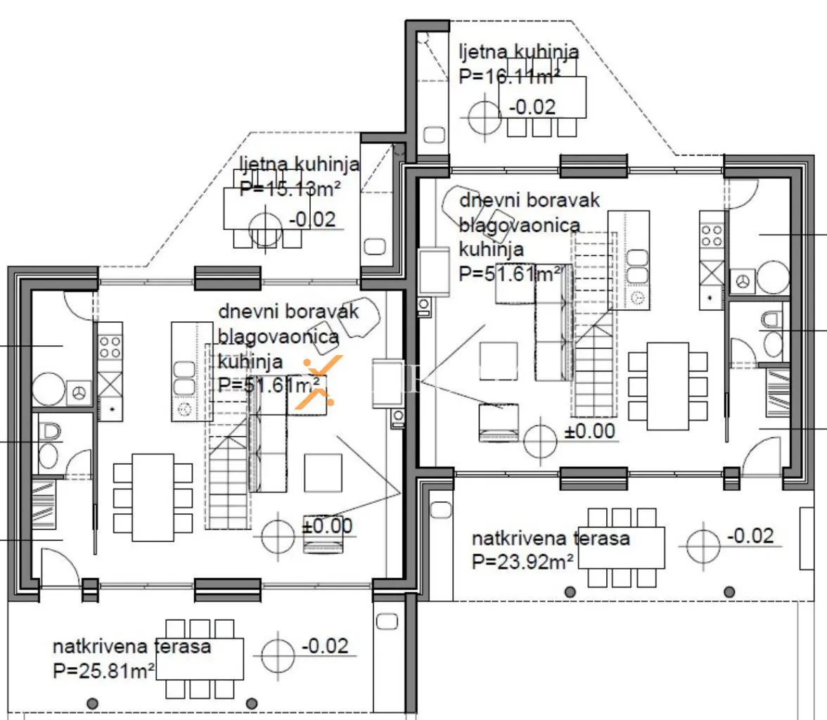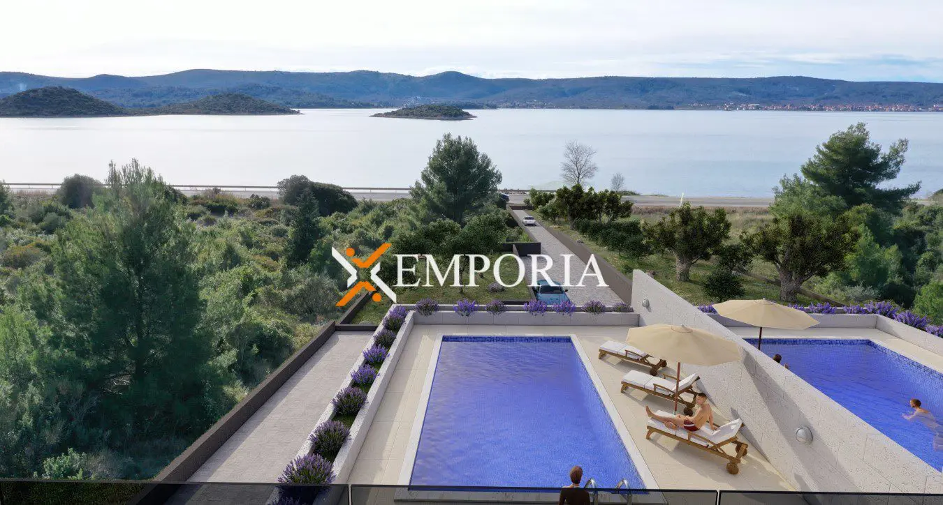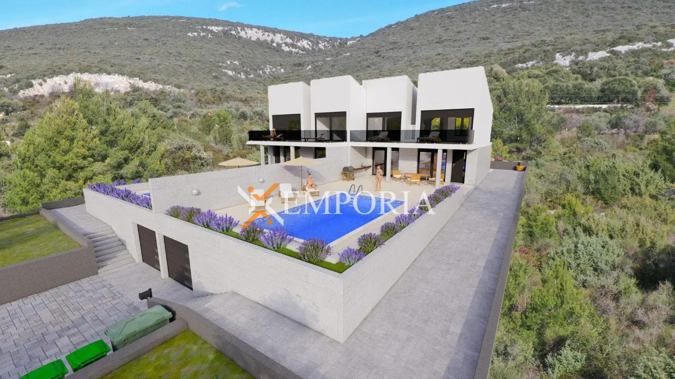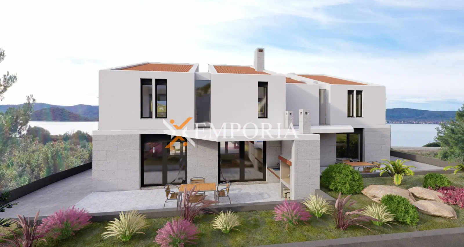 Im Erdgeschoss jedes Hauses befindet sich ein geräumiges Wohnzimmer mit Küche und Essbereich, Eingang, Toilette, eine vordere und eine hintere überdachte Terrasse. Beide Terrassen bieten die Möglichkeit eine Sommerküche mit Grill einzurichten. Vor den Terrassen befindet sich ein separater Pool mit wunderschönem Ausblick auf das Meer.