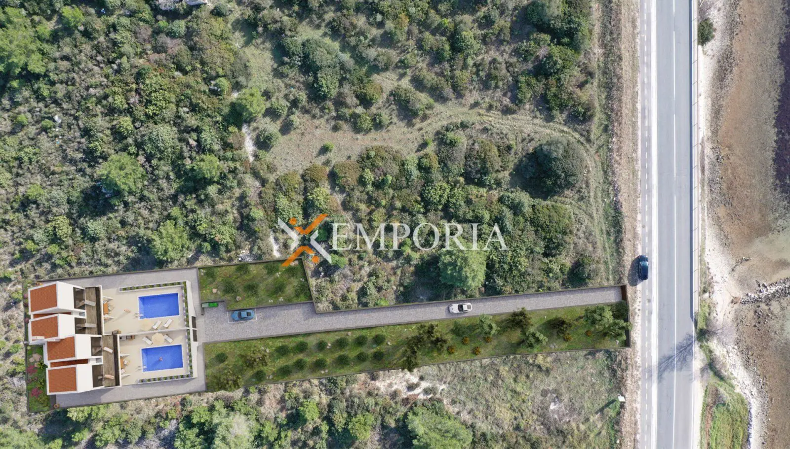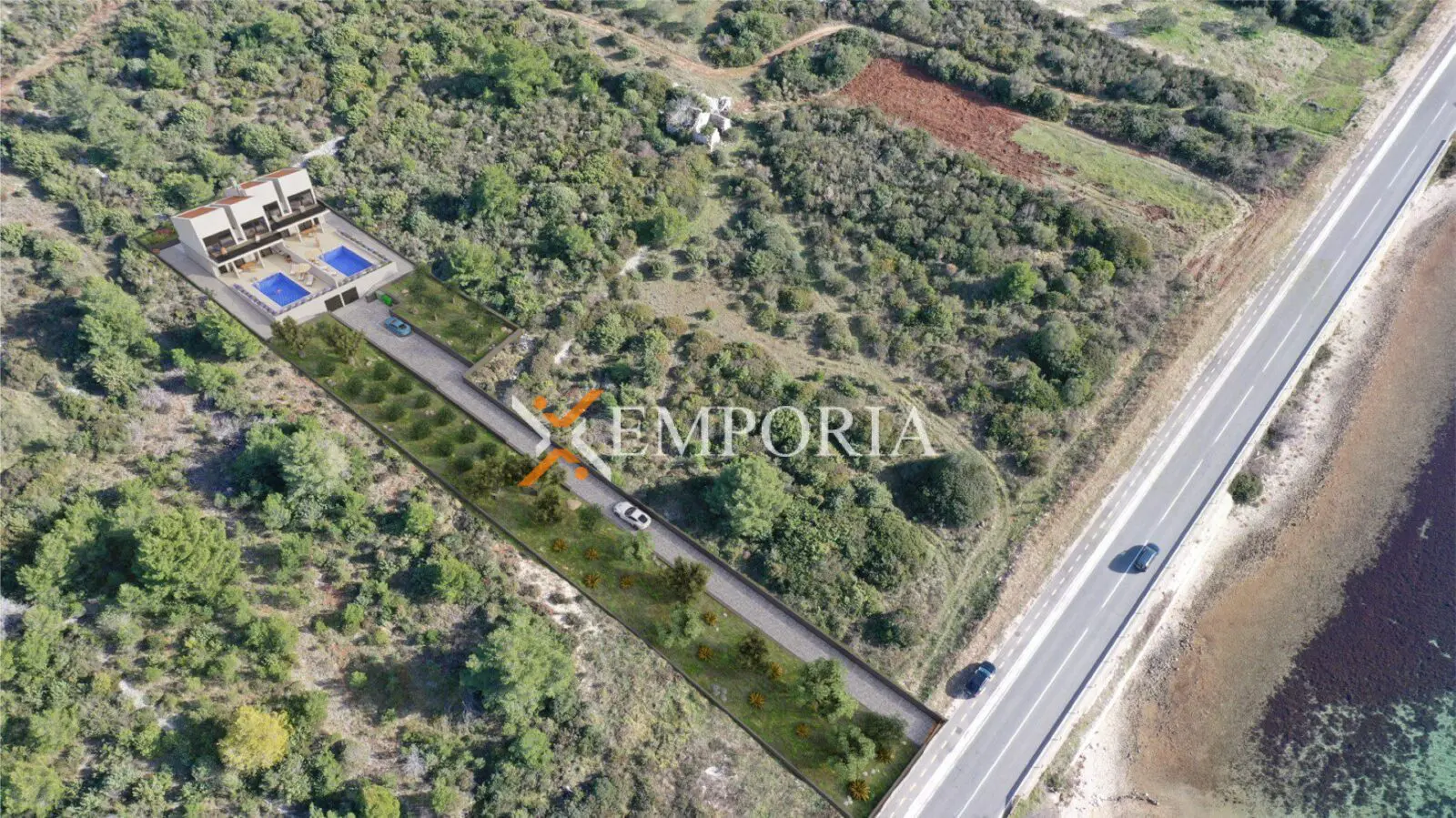 Das Grundstück hat eine Fläche von 2329 m2 und wird ausschließlich als Ganzes verkauft. Es ist 121,87 m lang und im oberen Teil ist es 25,83 m breit.