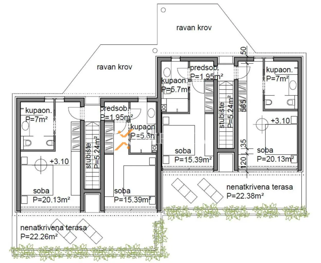 Ein Treppenhaus führt in den ersten Stock, wo sich zwei Schlafzimmer mit jeweils eigenem Bad und eigenem Ausgang auf die Terrasse befinden. Jedes Objekt hat eine eigene Garage.