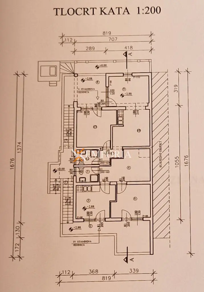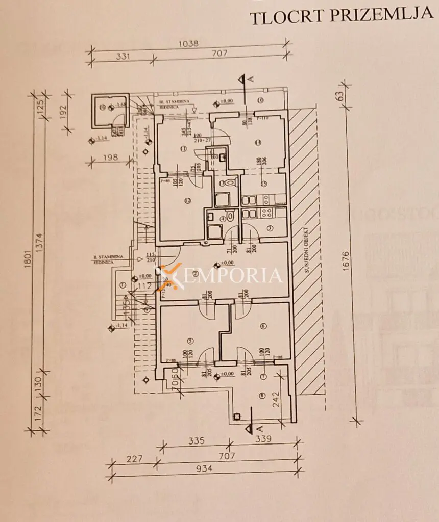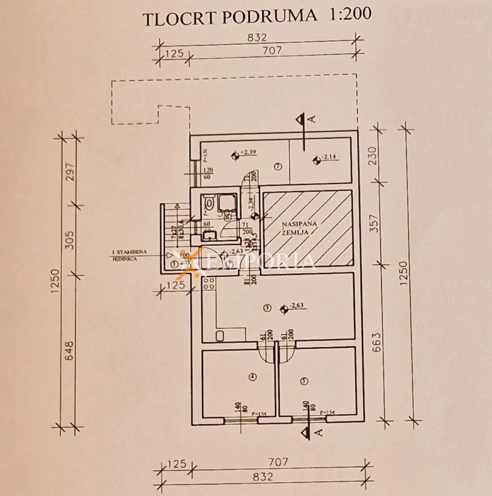 Das Haus besteht aus Keller, Erdgeschoss und Obergeschoss. Im Untergeschoss befindet sich eine Wohnung mit zwei Schlafzimmern und ein Abstellraum. Fläche des Kellers beträgt 75,16 m2. Es gibt zwei Wohnungen im Erdgeschoss, eine mit einem und die andere mit zwei Schlafzimmern. Das Erdgeschoss hat eine Gesamtfläche von 116,80 m2. Im ersten Stock befinden sich zwei weitere Wohnungen mit je einem Schlafzimmer. Der 1. Stock hat 105,87 m2.