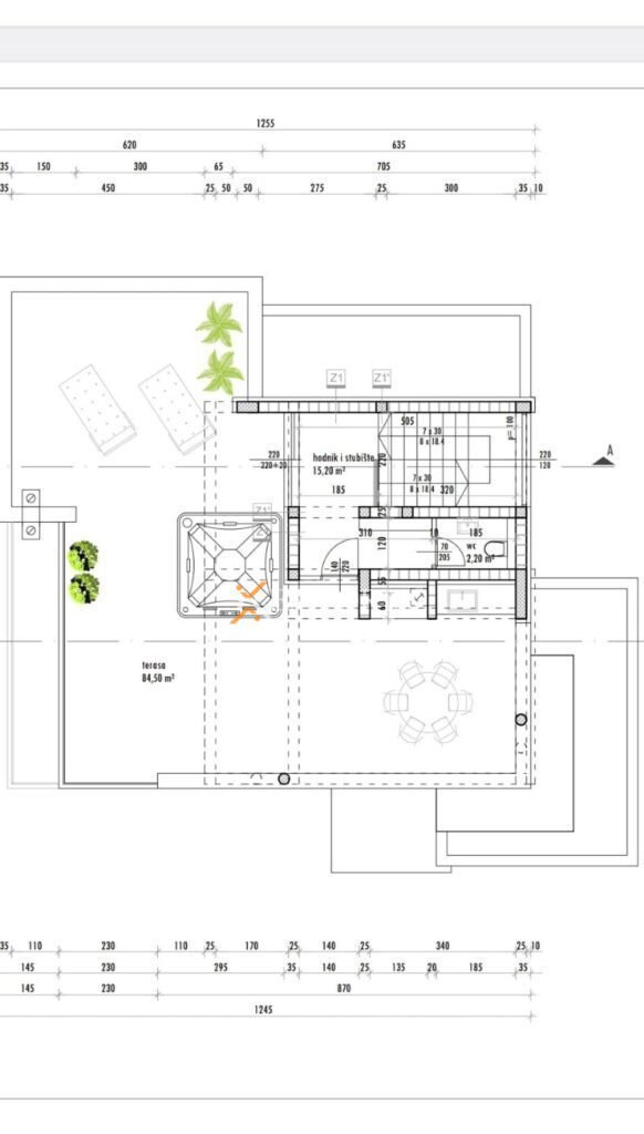 Das Haus besteht aus Erdgeschoss und erstem Stock. Die Raumaufteilung im Erdgeschoss besteht aus einem Flur, einer Waschküche, einem Badezimmer, einer Küche mit Esszimmer, einem Wohnzimmer, einer überdachten Terrasse und einer Garage. Eine Innentreppe führt in den ersten Stock, wo sich ein Flur, vier Schlafzimmer mit jeweils eigenem Bad und eine teilweise überdachte Terrasse befinden. Innentreppen führen weiter zur Dachterrasse von 84,50 m2.