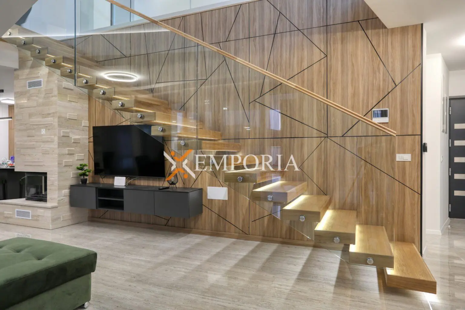 Das Haus besteht aus Erdgeschoss und ersten Stock. Das Erdgeschoss besteht aus Flur, Toilette, Waschküche, Wellnessbereich, Fitnessraum, Küche mit Esszimmer und Wohnzimmer sowie einer überdachten Terrasse. Die Terrasse des Erdgeschosses ist mit einem 30 m2 großen Pool ausgestattet. Darüber hinaus führt die Innentreppe in den ersten Stock, wo sich ein Flur, vier Schlafzimmer mit jeweils eigenem Bad und eine Loggia befinden.