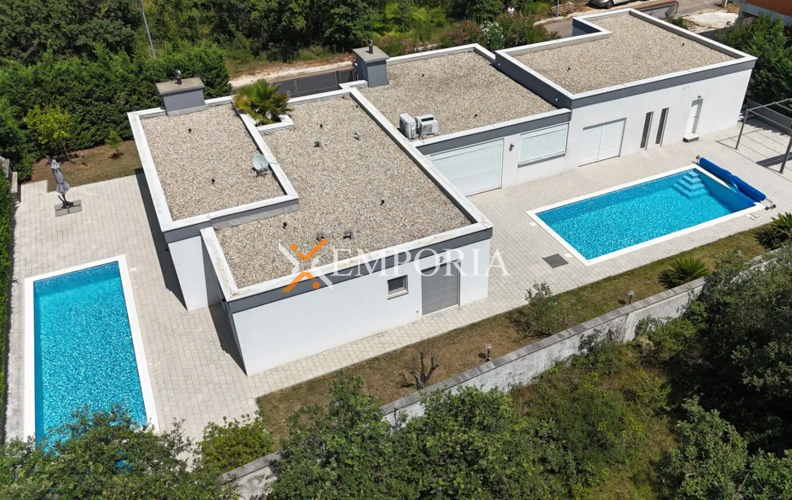 Im Garten gibt es vier Außenparkplätze und einen Parkplatz in der Garage. Zwei Pools mit einer Fläche von 30 m² und 40 m² schmücken den schön angelegten Garten. Die Pools sind mit Mosaikfliesen verkleidet.
