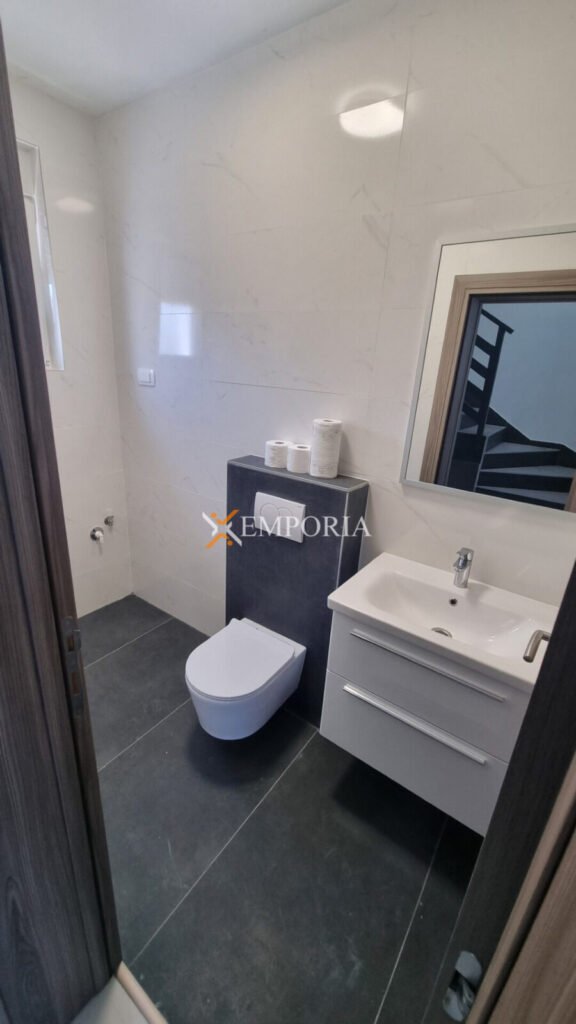 Das Haus besteht aus Erdgeschoss und erstem Stock. Die Raumaufteilung im Erdgeschoss umfasst einen überdachten Eingang, Flur, Küche mit Esszimmer, Wohnzimmer und eine Toilette. Eine Innentreppe führt in den ersten Stock, wo sich ein Flur, drei Schlafzimmer, jedes mit eigenem Badezimmer. Die Innentreppe führt weiter auf die Dachterrasse mit einer Fläche von 66,02 m2.