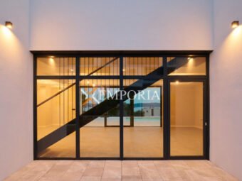 Die Villa ist aus Betonwänden gebaut, hat eine 10 cm dicke Styroporfassade, dreifach verglaste Aluminiumfenster mit elektrischen Rollläden und eine einbruchssichere Eingangstür. Ein Kamin mit Schornstein ist vorhanden. Die Böden sind mit Parkett und Mikrozement versehen. Die Beheizung erfolgt über elektrische Fußbodenheizung im gesamten Haus. Zudem sind fünf Klimaanlagen installiert – eine im Wohnzimmer und je eine in jedem Schlafzimmer. Die Immobilie verfügt über einen Energieausweis der Klasse A.